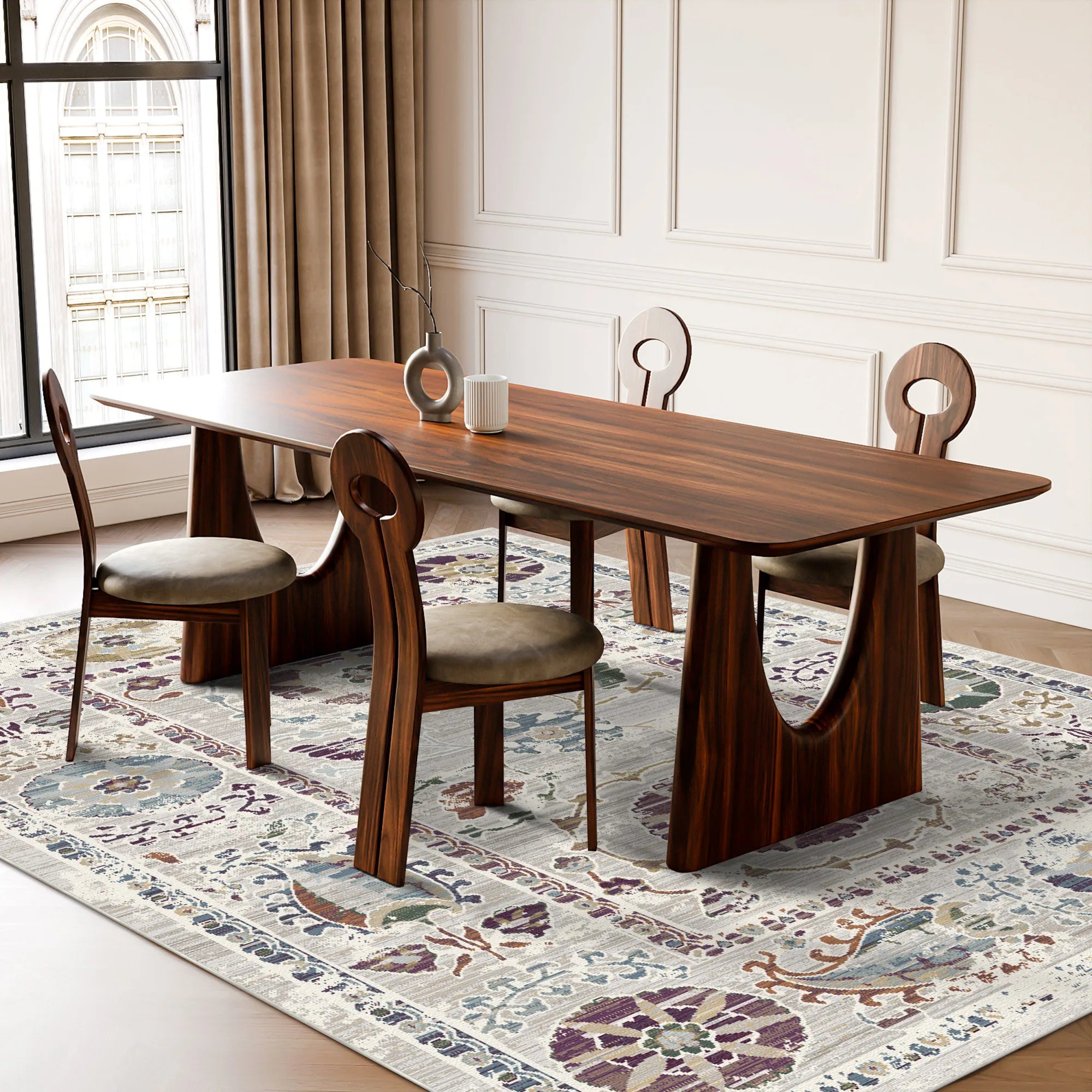 Verleihen Sie Ihrem Zuhause mit dem waschbaren Teppich „Ethereal Flora Verse“ eine poetische Ruhe. Dieses Design ist eine zarte Neuinterpretation exotischer orientalischer Motive mit geisterhaften Sonnenmedaillons und verspielten Paisley-Akzenten (Buta), die über einem leuchtenden elfenbeinfarbenen Grund zu schweben scheinen. Die bewusst sanfte und luftige Farbpalette wird durch verblasste Akzente in Pflaume, Salbeigrün und gedecktem Türkis akzentuiert, die wie Aquarellfarben auf gealtertem Pergament wirken. Mit seinen markanten horizontalen Streifen und den bewusst ausgewaschenen Rändern fühlt sich dieser Teppich wie ein seltenes botanisches Relikt aus einem verlorenen Garten an. Er ist die perfekte Wahl für ein romantisches Schlafzimmer im Shabby-Chic-Stil, einen lichtdurchfluteten Wintergarten oder einen modernen, minimalistischen Wohnbereich, der einen Hauch von historischem Charme benötigt.