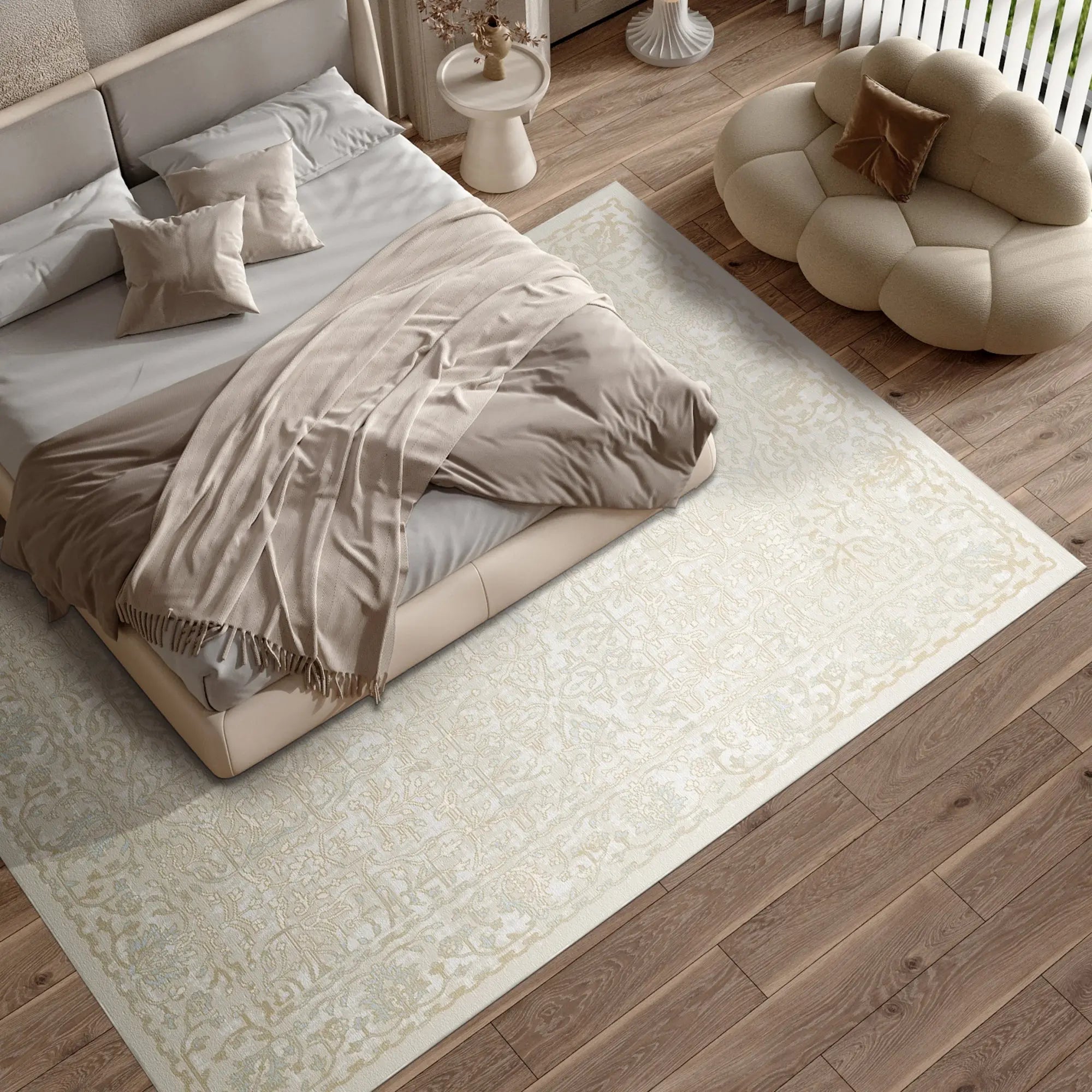 Der Teppich „Alabaster Scroll Spectral Beige“ ist eine Hommage an klassische Eleganz und sanfte, moderne Texturen. Sein Design besticht durch ein filigranes Netz aus ineinandergreifenden Ranken und botanischen Bordüren in einer zarten Farbpalette aus Creme, Elfenbein und Sandbeige. Der „spektrale“ Effekt entsteht durch subtile Grautöne und zarte Nuancen von Staubblau, wodurch das kunstvolle Muster wie natürlich in feinen Alabasterstein eingraviert wirkt. Er bildet eine helle, elegante Grundlage für sonnendurchflutete Wohnzimmer, luftige Master-Suiten oder modern-organische Interieurs.