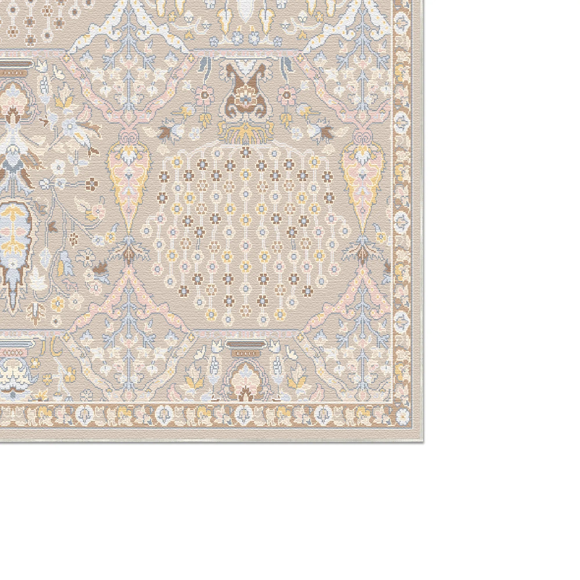 Verleihen Sie Ihrem Rückzugsort mit dem waschbaren Teppich „Alya Pearl Bouquet“ eine ätherische Eleganz und filigrane botanische Motive. Dieses Design ist ein Meisterwerk sanfter Raffinesse: Ein leuchtendes Champagner-Sandfeld ist in ein rhythmisches Wabenmuster aus kunstvollen floralen Nischen angeordnet. Innerhalb dieser zart umrandeten Felder erblühen üppige „Shah Abbasi“-Blumensträuße und weinende Weidenranken in einer zarten Farbpalette aus Perlgrau, Altrosa und gedecktem Salbeigrün. Die Komposition bietet eine atemberaubende Balance aus klassischer persischer Symmetrie und einer modernen, dezenten Ästhetik und ist damit die perfekte Wahl für eine romantische Master-Suite, ein exklusives Kinderzimmer oder ein lichtdurchflutetes Wohnzimmer, das einen Hauch von unaufdringlichem Luxus benötigt.