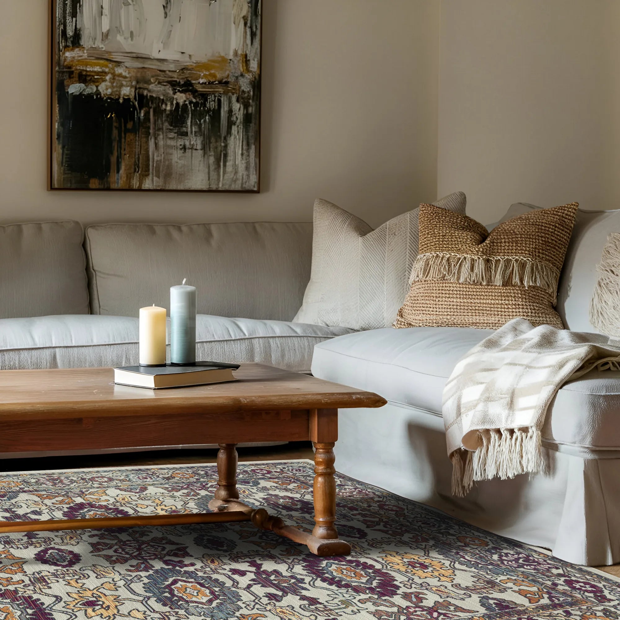 Erhellen Sie Ihr Refugium mit der ätherischen Schönheit und dem geschichtsträchtigen Charme des waschbaren Teppichs „Antique Bone Palmette Floral “. Dieses Design ist eine poetische Hommage an historische Meisterwerke aus Sultanabad und besticht durch ein großflächiges Muster aus anmutig gealterten Palmetten und geschwungenen Blättern. Der leuchtende Teppichboden erstrahlt in ruhigem Knochenweiß und antikem Elfenbein, dessen bewusst abgenutzte Oberfläche eine Vintage-Patina erzeugt, die an einen seltenen textilen Schatz erinnert, der auf einem sonnendurchfluteten Dachboden gefunden wurde. Zarte Akzente in gedämpftem Pflaumenrot, sanftem Azurblau und Honigbernstein tanzen über den neutralen Hintergrund und schaffen eine raffinierte visuelle Dynamik, die gleichermaßen königlich und bemerkenswert dezent ist. Er ist die perfekte Wahl für ein helles skandinavisches Wohnzimmer, ein ruhiges, modernes Schlafzimmer oder ein elegantes Arbeitszimmer im Übergangsstil, das historische Eleganz mit einer klaren, luftigen Atmosphäre verbinden möchte.