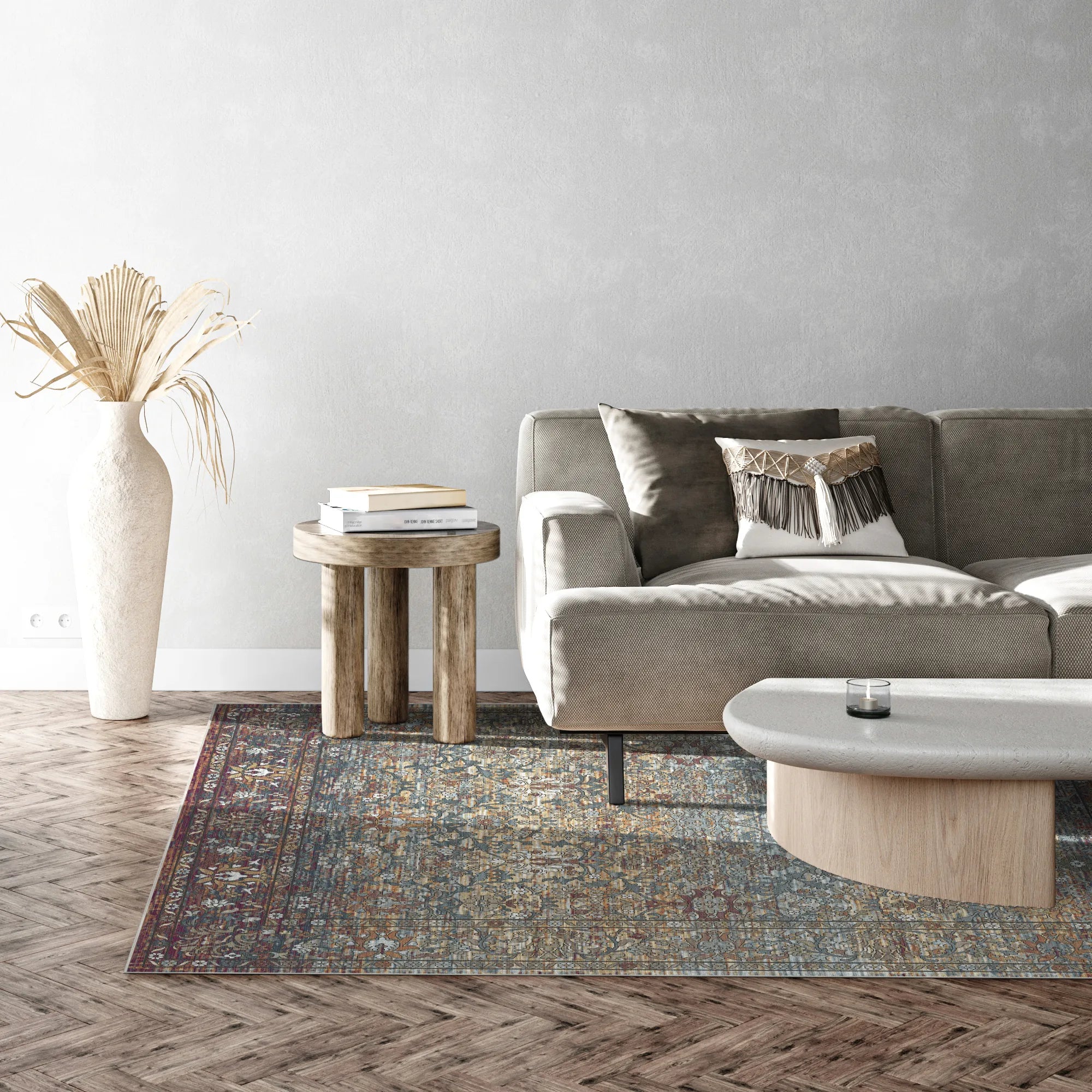 Tauchen Sie ein in eine lebendige Welt aus historischer Romantik und modernem Impressionismus mit dem waschbaren Teppich „Antique Multi Meadow“ . Dieses Design interpretiert den detailreichen botanischen Stil „Bakhtiari“ auf kühne und künstlerische Weise neu. Die Oberfläche besticht durch einen raffinierten horizontalen Farbverlauf, in dem tiefes Indigoblau, sattes Terrakotta und goldener Bernstein zu einer dynamischen, fast gemalten Atmosphäre verschmelzen. Vor diesem kontrastreichen Hintergrund entfaltet sich ein flächendeckendes Muster aus zarten Ranken und Miniaturblüten in Elfenbein, Salbei und gebrannter Siena. Mit seiner bewusst gealterten, vintage-inspirierten Patina ist dieser Teppich ein Meisterwerk des Übergangsdesigns und eignet sich perfekt, um einem gemütlichen Wohnzimmer, einem stilvollen Essbereich oder einer Master-Suite, die Wärme und architektonische Tiefe verlangt, einen besonderen Akzent zu verleihen.