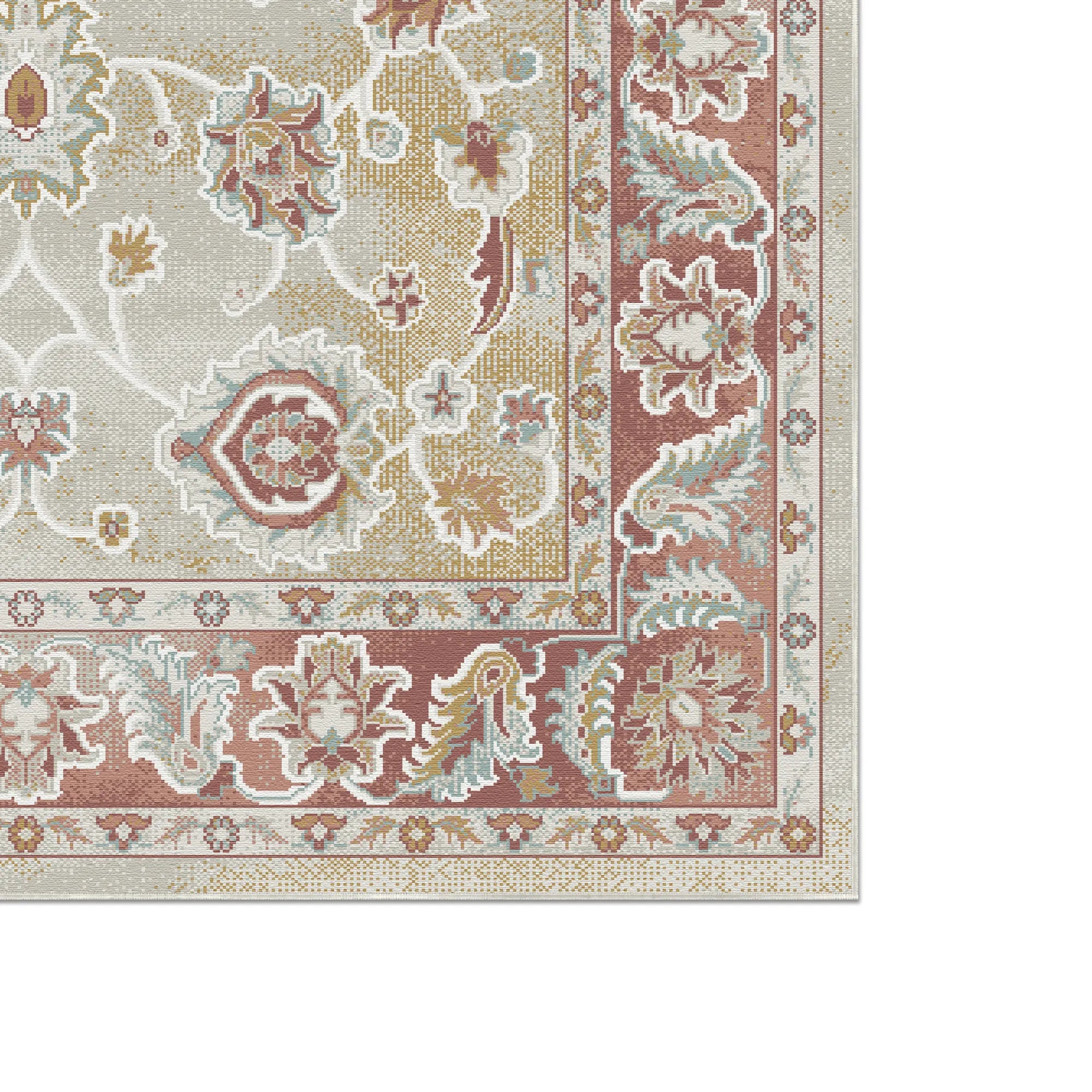 Ein leuchtender Teppich von erdiger Eleganz: Der Aura-Teppich „Scrolling Vine Terracotta“ verleiht Ihrem Zuhause eine natürliche Wärme und klassische Ausgewogenheit. Sein strahlendes, elfenbeinfarbenes Zentrum reflektiert das natürliche Licht und lässt Ihren Raum dadurch größer und luftiger wirken. Auf diesem leuchtenden Hintergrund sind zarte Ranken und sanfte, botanische Palmetten in gedeckten Blau- und Goldtönen kunstvoll angeordnet und verleihen dem Teppich eine raffinierte Vintage-Ästhetik. Die gesamte Komposition wird meisterhaft von einer imposanten, detailreichen Bordüre in sattem Terrakotta-Rost eingefasst, die dem Raum Eleganz und Anmut verleiht.