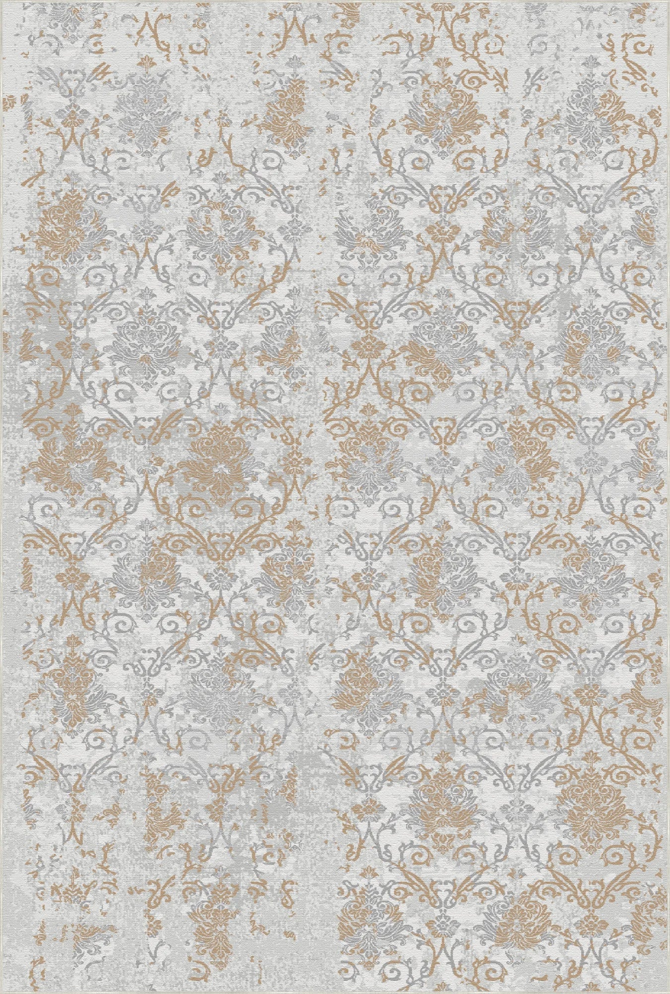Der Teppich „Amber Mist Eroded Damask“ verleiht Ihrem Interieur eine warme, sonnendurchflutete Eleganz. Das Design besticht durch ein klassisches Damastmuster, dessen wunderschöne Patina ein zartes Zusammenspiel von sandgoldenen, warmen elfenbeinfarbenen und dezenten grauen Akzenten offenbart. Die kontrastreiche und dennoch sanfte Farbpalette schafft eine raffinierte Vintage-Atmosphäre, die sowohl zu traditionellen als auch zu modern-organischen Einrichtungsstilen passt.