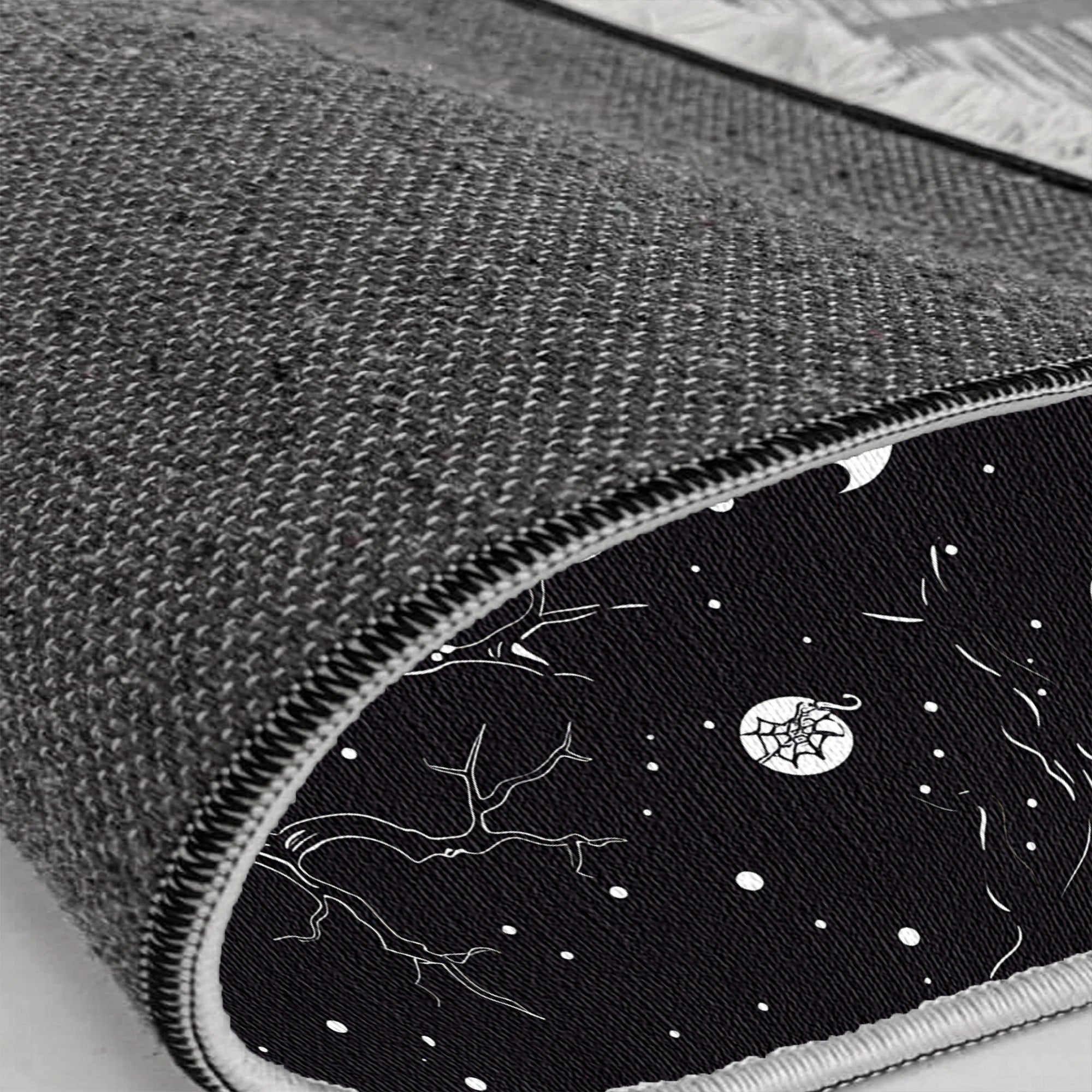 Schaffen Sie mit diesem gotischen Halloween-Teppich in Schwarz-Weiß eine dramatische, kontrastreiche Atmosphäre. Das markante Design wird von einem detailreichen, knorrigen, unheimlichen Baum dominiert, der sich aus der Mitte erhebt und von fliegenden Fledermaussilhouetten sowie gespenstischen Friedhofselementen wie Kreuzen und geschnitzten Kürbissen in Schwarz-Weiß umgeben ist. Diese monochrome Farbpalette bietet einen raffinierten und zugleich intensiv gruseligen Look und geht weit über traditionelle Orangetöne hinaus. Hergestellt aus strapazierfähigem Polyester mit einer angenehmen Florhöhe von 8 mm , ist dieser Teppich praktisch für stark frequentierte Bereiche und bleibt dabei angenehm weich. Seine stabile Baumwollrückseite und die vollständige Waschbarkeit garantieren eine mühelose Reinigung und einen dauerhaft eindrucksvollen Stil während der gesamten Saison.