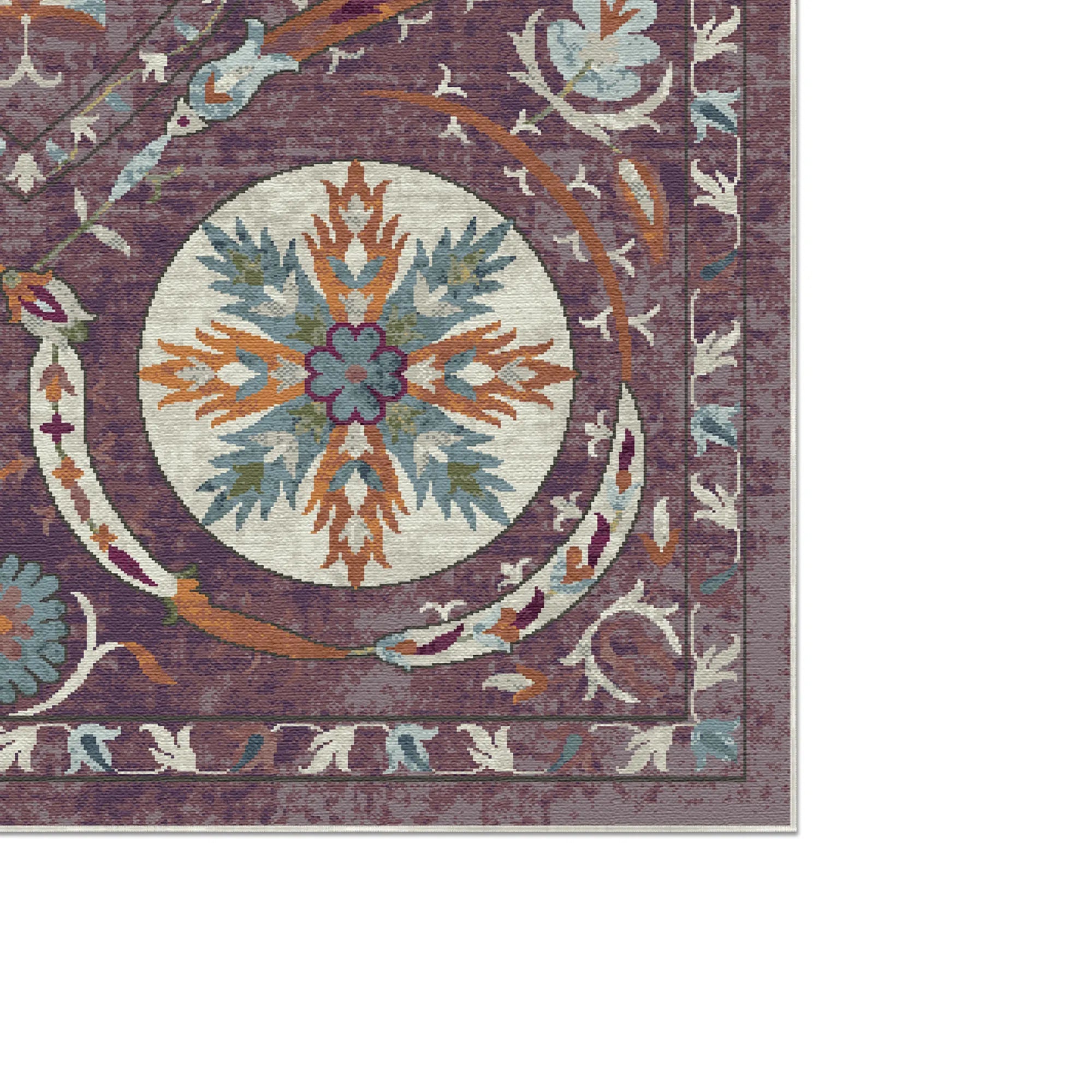Verleihen Sie Ihrem Raum mit dem waschbaren Teppich „Bukhara Mulberry Exotic Medallion“ eine besondere Note und eine nomadische Eleganz. Inspiriert von der jahrhundertealten „Blumensonne“-Stickerei zentralasiatischer Suzani-Textilien, besticht dieses Design durch ein faszinierendes Arrangement aus runden Medaillons und fließenden Ranken. Ein königlicher Hintergrund in tiefem Pflaumen- und Maulbeerrot bildet die majestätische Bühne für eine lebendige Farbpalette aus Goldsafran, Türkis und Elfenbein. Die bewusst sanfte Patina erzeugt einen wunderschönen Vintage-Effekt und lässt den Teppich wie einen seltenen textilen Schatz aus einem königlichen Archiv wirken. Er ist die perfekte Wahl für ein stilvolles Chefbüro, ein formelles Esszimmer oder eine elegante Master-Suite, die einen ausdrucksstarken künstlerischen Akzent mit einem Hauch historischer Mystik sucht.