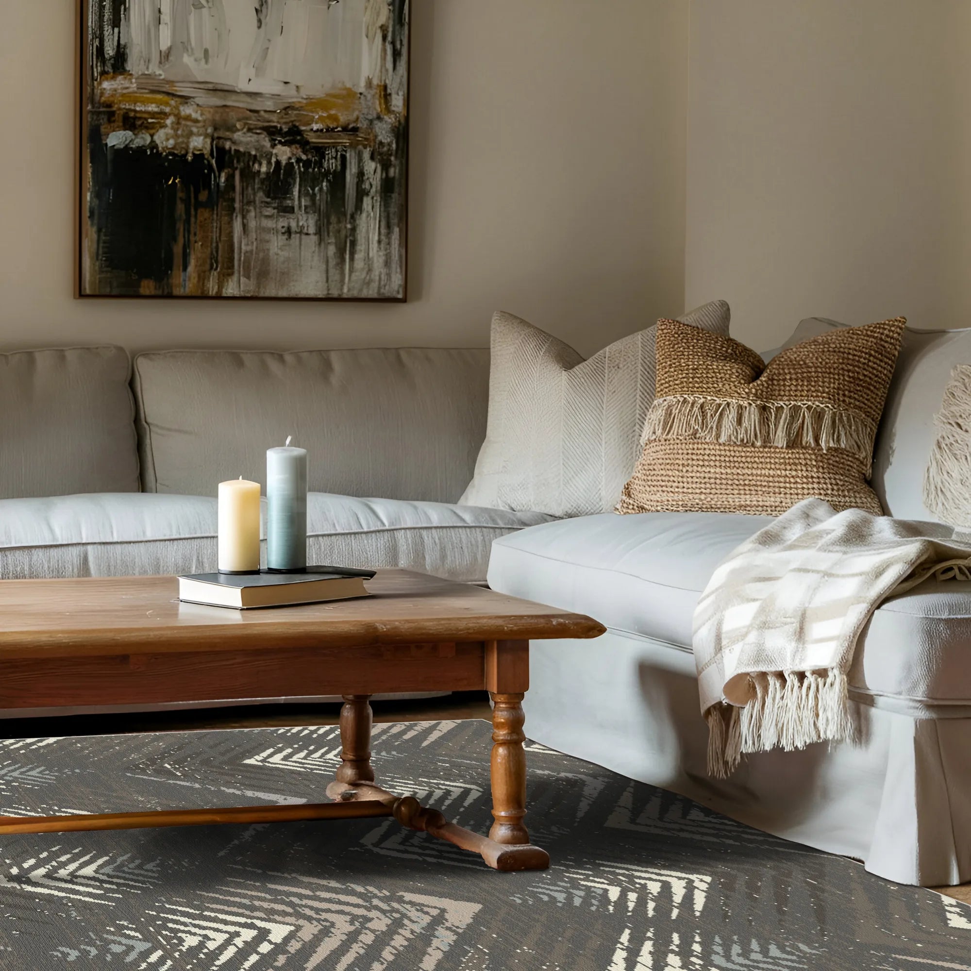 Verleihen Sie Ihrem Raum mit dem waschbaren Teppich „Canyon Shadow Abstract“ eine natürliche Eleganz. Diese markante Variante unserer abstrakten Serie besticht durch das stilisierte Chevron-Muster in einer satten, tiefen Farbpalette aus Mokkabraun, dunklem Anthrazitgrau und kontrastierenden Nuancen von warmem Taupe und Steinbeige. Die leicht abgenutzte Textur verleiht dem geometrischen Muster eine weiche, organische Anmutung, die an die rauen Schatten und die geschichteten Felsformationen einer Wüstenschlucht in der Abenddämmerung erinnert. Er ist die perfekte Ergänzung für modern-rustikale Wohnzimmer, zeitgenössische Arbeitszimmer oder Schlafzimmer, die einen Hauch von behaglicher Wärme benötigen.