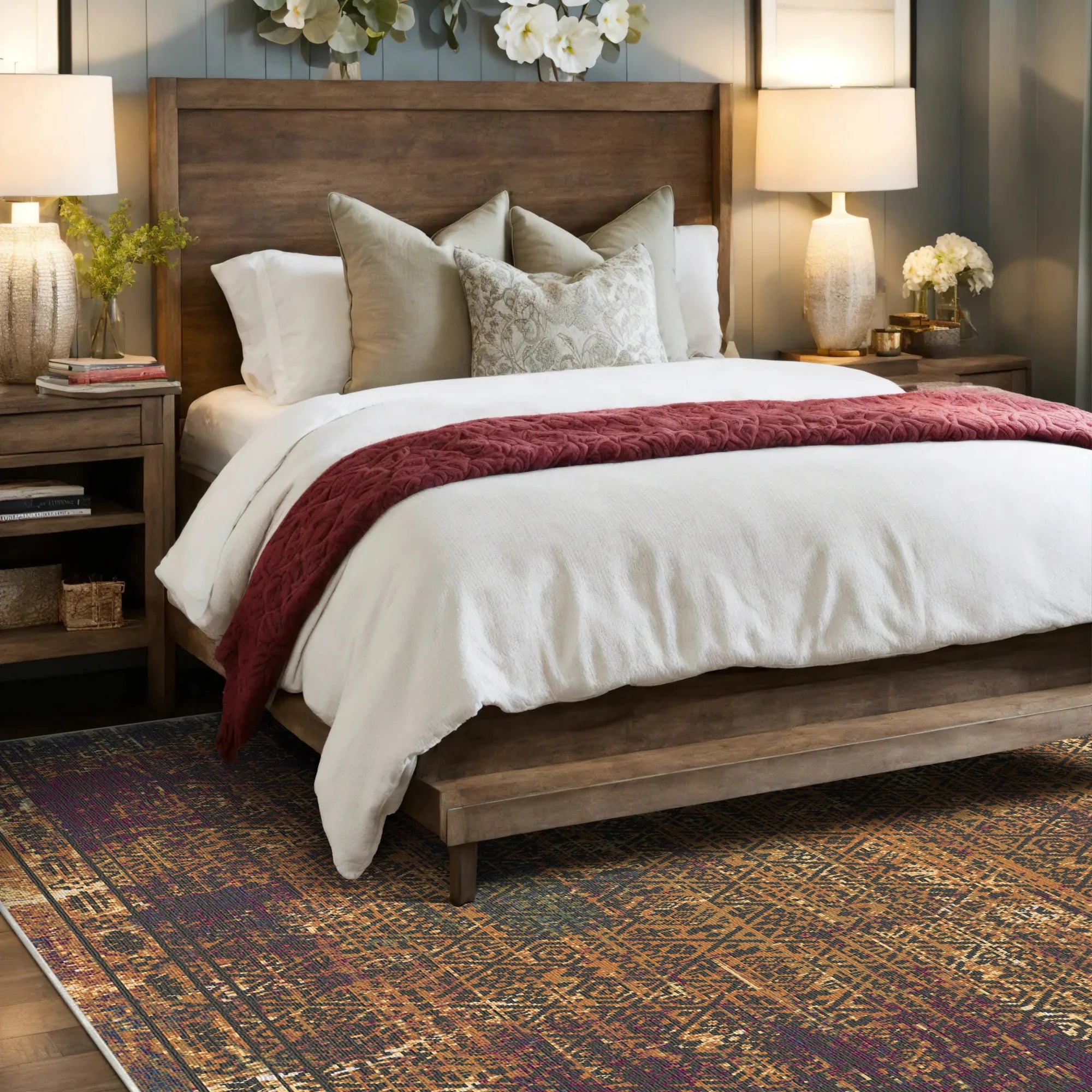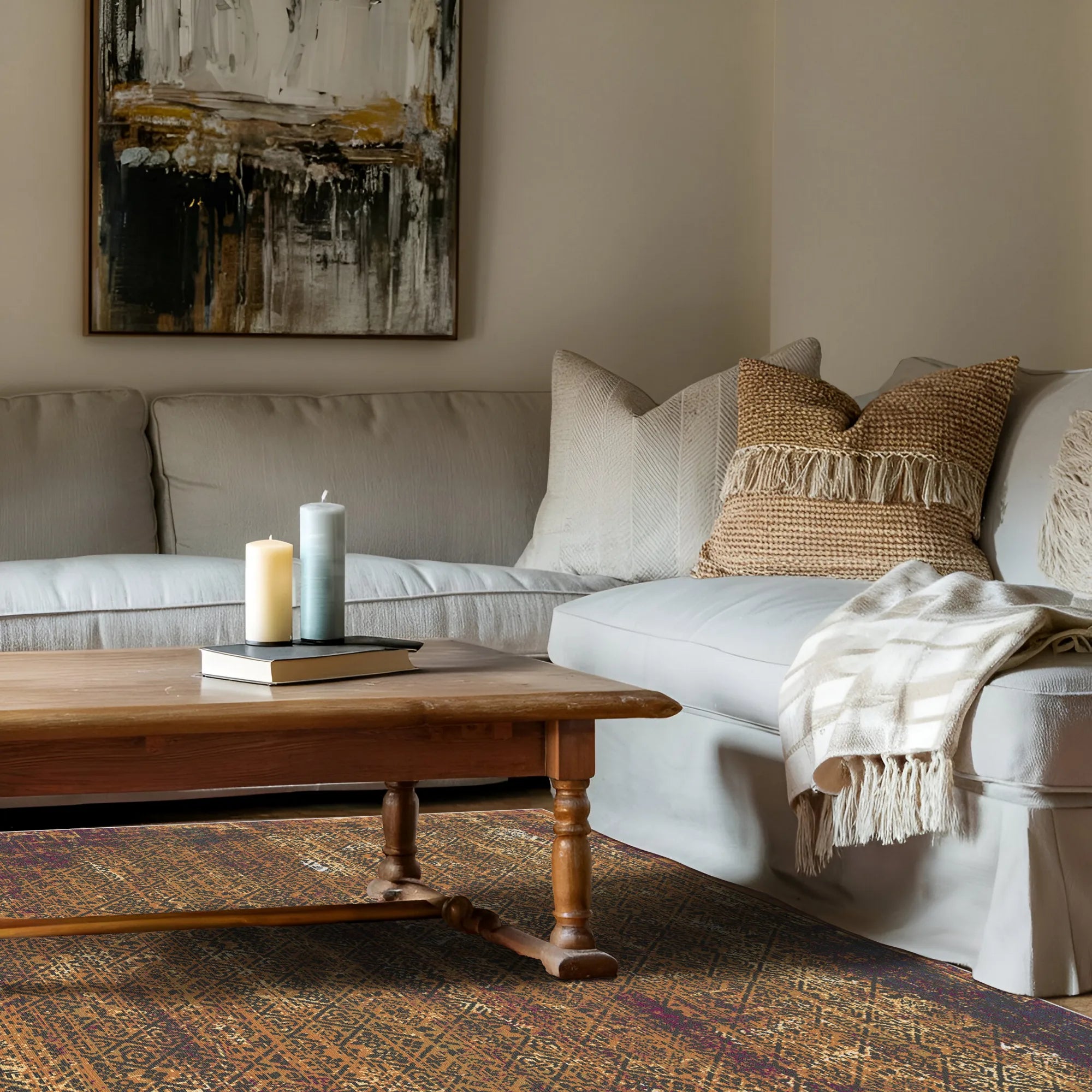 Genießen Sie die strahlende Wärme und die raffinierte Abstraktion des waschbaren Teppichs „Amber Cipher Geometric“ . Das Design besticht durch ein dichtes, mikroskopisches Gitter geometrischer Motive, die wie ein wunderschönes digitales Relikt im goldenen Licht der Abendsonne über die Oberfläche zu schimmern und zu verschmelzen scheinen. Die Farbpalette ist eine sonnenverwöhnte Hommage an erdigen Luxus: Sattes Bernsteingold und Terrakotta-Rost vereinen sich mit rauchigen Schattierungen von tiefem Pflaumenrot und Anthrazit. Meisterhaft bearbeitet mit markanten horizontalen Streifen und einem extremen, „ausgewaschenen“ Stone-Wash-Finish, besitzt der Teppich den charaktervollen Charme eines antiken, vergoldeten Textils, neu interpretiert durch eine moderne Brille. Er ist die perfekte Wahl für ein gemütliches, modernes Wohnzimmer, einen hellen Wintergarten oder ein Schlafzimmer im Übergangsstil, das eine strukturierte, erdende Basis mit einer leuchtenden und geheimnisvollen Ausstrahlung benötigt.