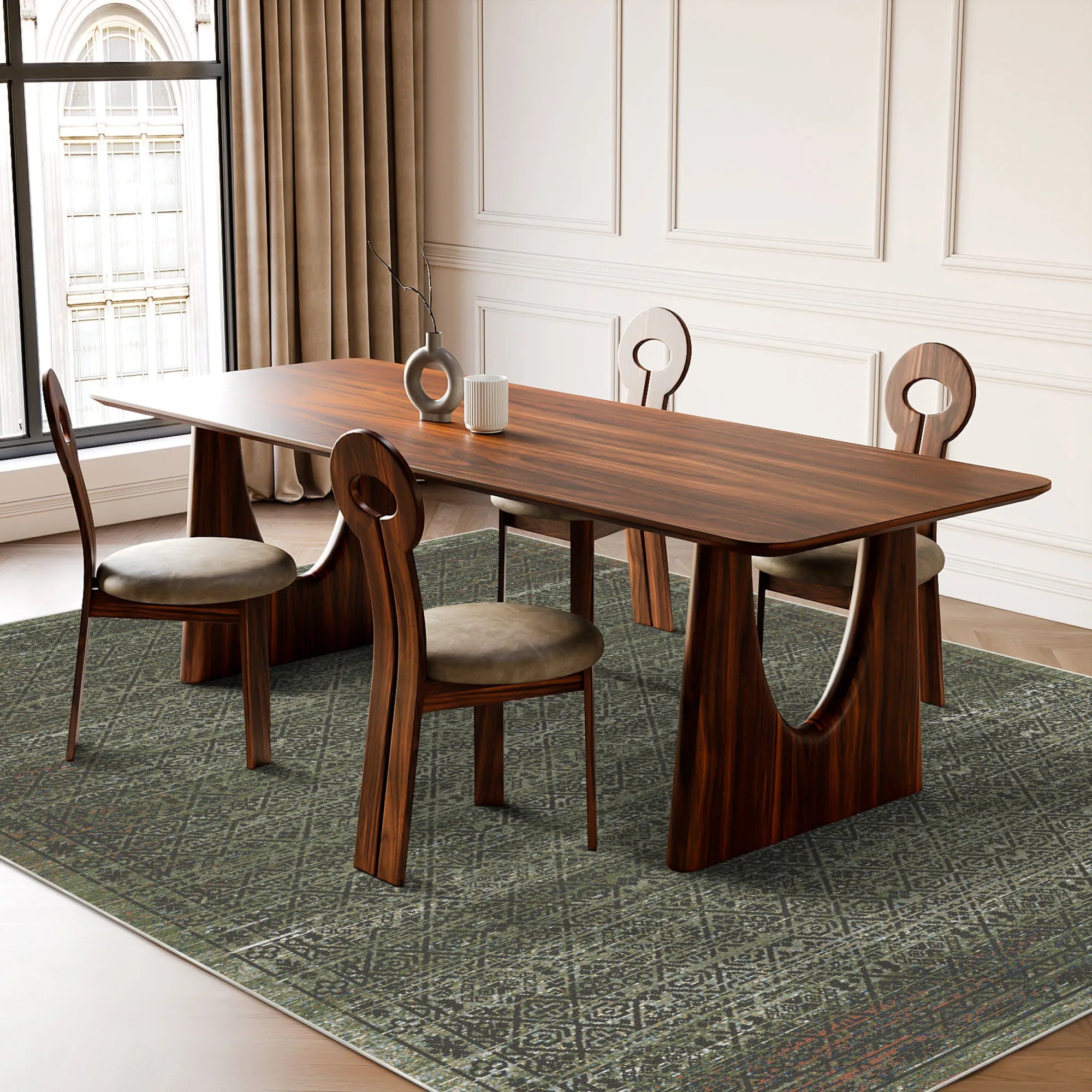 Der Teppich „Verdant Cipher Geometric“ vereint auf meisterhafte Weise die atemberaubende Ästhetik eines Schattenspiels mit den Anforderungen des modernen Haushalts. Er ist aus hochwertigen, hochdichten Polyesterfasern gewebt und bietet ein samtweiches, wolkenartiges Gefühl unter den Füßen bei gleichzeitig hoher Strapazierfähigkeit. Dank unserer fortschrittlichen Farbfixierungstechnologie bleiben die satten Grüntöne und die dezenten elfenbeinfarbenen Akzente auch nach vielen Wäschen brillant. Für maximale Sicherheit sorgt die hochwertige, integrierte rutschfeste Unterseite, die fest auf Ihren Parkett- oder Fliesenböden haftet und dafür sorgt, dass der Teppich ohne zusätzliche Unterlagen perfekt flach und sicher liegt. Der Teppich ist vollständig maschinenwaschbar und für die Reinigung mit Saugrobotern optimiert. Er bringt den zeitlosen Charme eines gealterten, botanischen Meisterwerks in Ihr Zuhause – ganz ohne Pflegeaufwand.