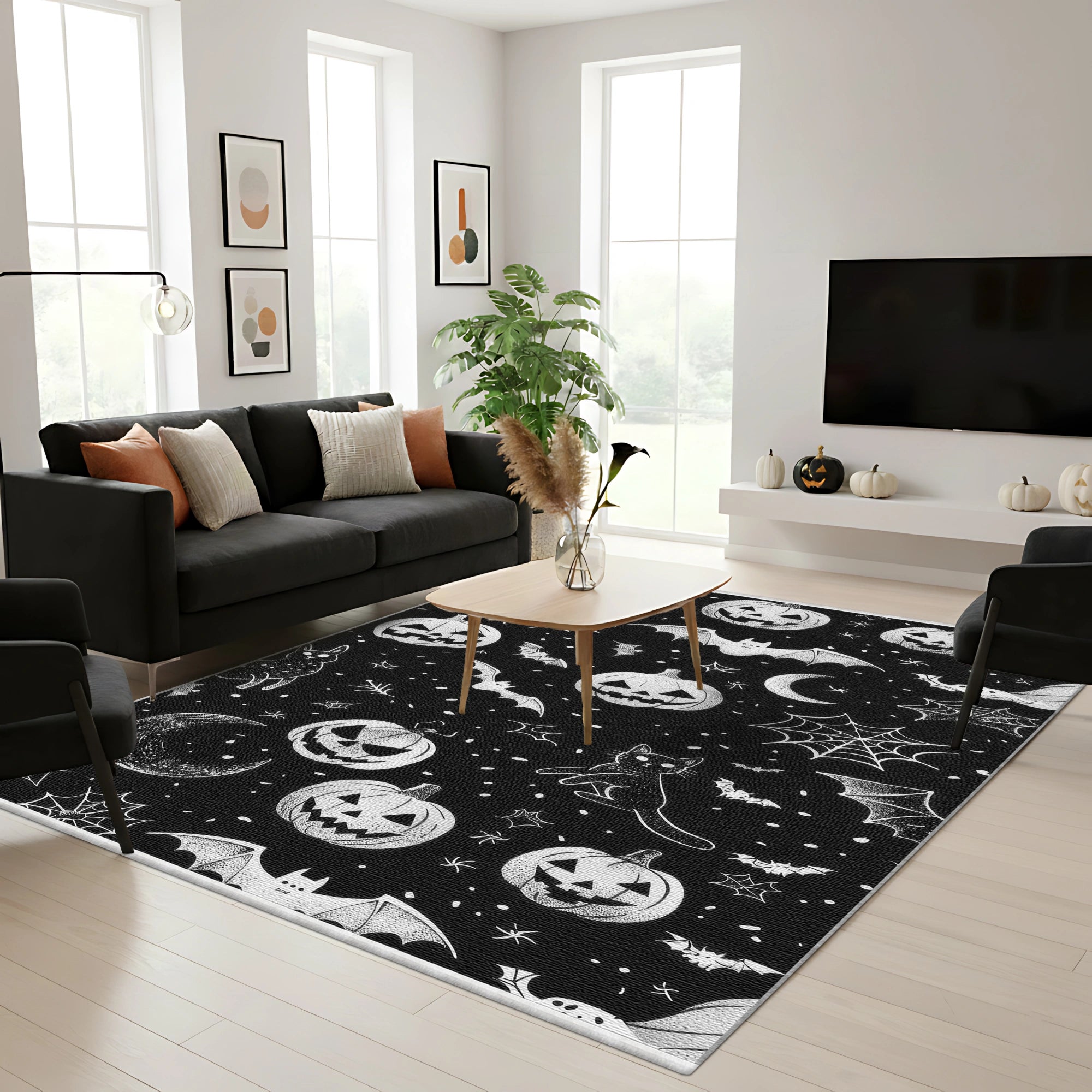 Verleihen Sie Ihrem Zuhause mit diesem einzigartigen Halloween-Teppich mit Katzen- und Kürbismotiv in Schwarz-Weiß einen Hauch verspielter Eleganz. Das Design besticht durch ein charmantes, dichtes Muster klassischer Halloween-Symbole, die in klaren Schwarz-Weiß-/Grautönen auf einem strukturierten, dunklen Hintergrund gehalten sind. Das detailreiche Muster umfasst stilisierte schwarze Katzen, verschiedene fliegende Fledermäuse, Halbmonde, kunstvolle Spinnennetze und grinsende Kürbislaternen. Dank seines starken Kontrasts ist der Teppich ein ideales Highlight für eine moderne oder traditionelle Halloween-Dekoration.