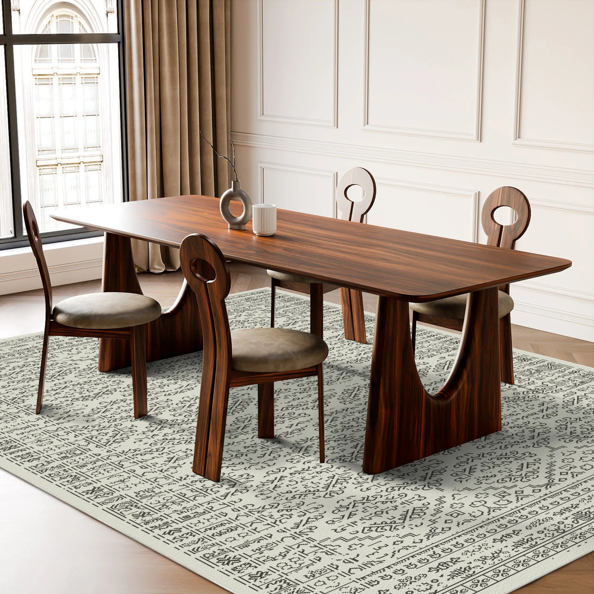 Wir sind überzeugt, dass ein so harmonisches und elegantes Design der lebendigen Atmosphäre eines Zuhauses standhalten muss. Dieser Teppich wurde meisterhaft aus hochwertigen, dichten Polyesterfasern gewebt, die sich luxuriös weich und geschmeidig anfühlen und gleichzeitig eine hervorragende Strapazierfähigkeit im Alltag bieten. Die strahlende Farbpalette in Elfenbein und Weiß wurde fachmännisch ausgewählt, um Ihren Wohnraum zu erweitern und aufzuhellen. Dank der hohen Fleckenbeständigkeit der Fasern bleiben die feinen Details jahrelang frisch und klar. Die hochwertige, rutschfeste Unterseite sorgt für festen Halt auf Ihren Parkett-, Fliesen- oder Laminatböden und gewährleistet, dass der Teppich ohne zusätzliche Unterlagen flach und sicher liegt.