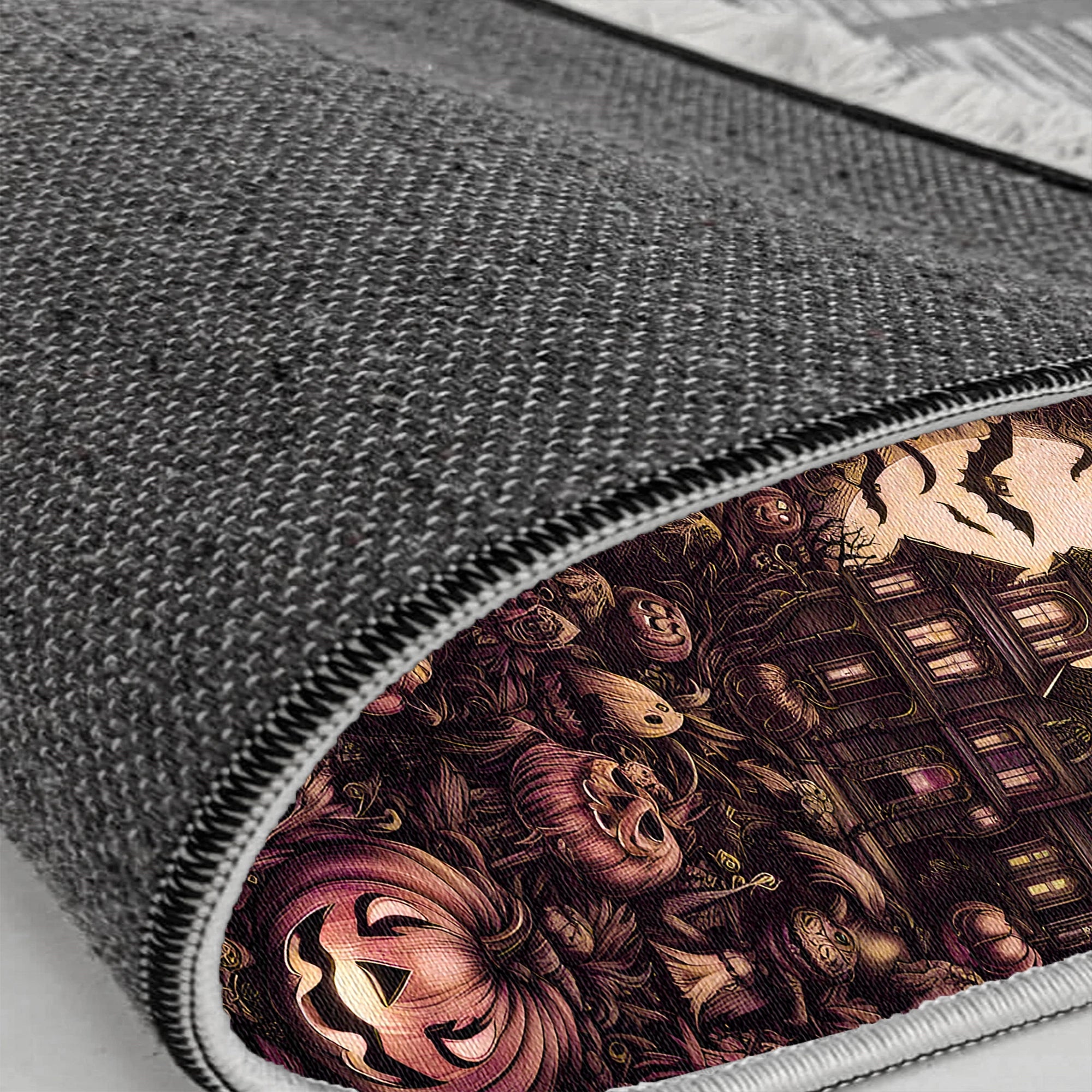 Schaffen Sie mit diesem detailreichen Halloween-Teppich „Haunted Mansion Pumpkin Orange“ eine stimmungsvolle und luxuriöse Atmosphäre. Das Design ist ein Meisterwerk düsterer Fantasy-Kunst und zeigt ein detailreiches, unheimliches Spukhaus, das im Licht eines fahlen Vollmonds liegt und von Fledermausschwärmen umgeben ist. Die gesamte Fläche ist mit Dutzenden einzigartig geschnitzten, bedrohlichen Kürbissen, Skelettfiguren und subtilen Geistern bedeckt, die alle in satten, stimmungsvollen Tönen von Tiefviolett, Karmesinrot und Schwarz gehalten sind.