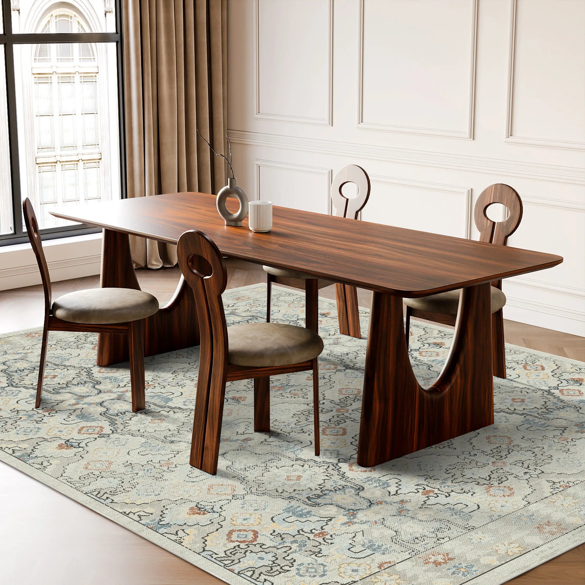 Der Teppich Lumina Gray Cream Geometric vereint auf meisterhafte Weise atemberaubende geometrische Ästhetik mit den Anforderungen des modernen Haushalts. Er ist aus hochwertigen, hochdichten Polyesterfasern gewebt und bietet ein samtweiches, wolkenartiges Gefühl unter den Füßen bei gleichzeitig hoher Strapazierfähigkeit. Dank unserer fortschrittlichen Farbfixierungstechnologie bleiben die filigranen Rautenmuster und die zarten neutralen Farbtöne auch nach vielen Wäschen strahlend schön. Für maximale Sicherheit sorgt die hochwertige, integrierte rutschfeste Unterseite, die fest auf Ihren Parkett- oder Fliesenböden haftet und dafür sorgt, dass der Teppich ohne zusätzliche Unterlagen perfekt flach und sicher liegt. Der Teppich ist vollständig maschinenwaschbar und für die Verwendung mit Saugrobotern optimiert. So bringt er den zeitlosen Charme eines kunstvollen Teppichs aus aller Welt ganz ohne Pflegeaufwand in Ihr Zuhause.