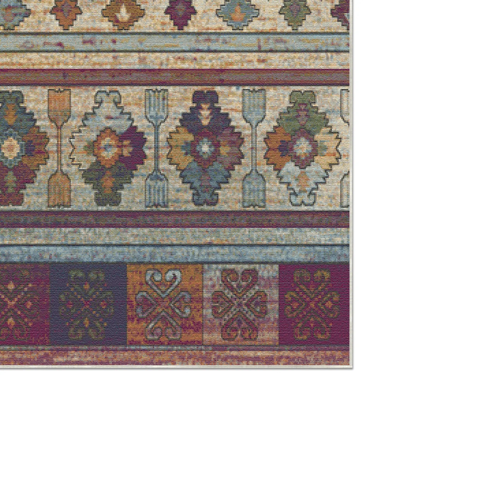 Verleihen Sie Ihrem Zuhause mit dem waschbaren, Gestreiften Teppich „Magenta Narrative Striped“ eine besondere Note. Diese lebendige Neuinterpretation unserer „Narrative“-Serie besticht durch horizontale Streifen mit filigraner Stammesgeometrie, die wie ein antiker Wandteppich aus Symbolen wirken. Die Farbpalette ist eine Hommage an Sonnenuntergang und Erde: Sattes Magenta-Pflaume und Salbeigrün vereinen sich mit leuchtenden Akzenten in Senfgold und Terrakotta-Rost. Meisterhaft gealtert mit einer weichen, wohnlichen Patina und dezenten horizontalen Streifen, besitzt dieser Teppich den einzigartigen Charakter eines geschätzten Textils aus einem Bergdorf. Er ist die perfekte Wahl für ein gemütliches Wohnzimmer im Bohème-Stil, einen lebhaften Essbereich oder einen kontrastreichen Flur, der eine strukturierte, farbenfrohe Basis mit einladendem, handwerklichem Flair verlangt.