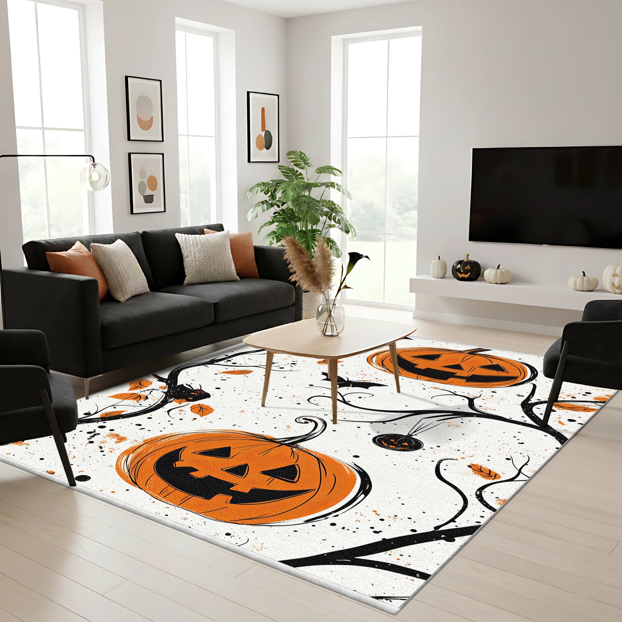 Verleihen Sie Ihrem Zuhause mit diesem minimalistischen, waschbaren Kürbis-Herbstteppich einen Hauch von künstlerischem, herbstlichem Charme. Das Design besticht durch einen frischen, strahlend weißen Hintergrund, der einen starken Kontrast zu den stilisierten schwarzen und orangen Elementen bildet. Große, skizzenhaft anmutende Kürbislaternen, dekorative schwarze Zweige mit herabfallenden orangen Blättern und fliegende Fledermäuse zieren den Teppich. Die handgezeichnete Ästhetik und die großzügigen weißen Flächen verleihen ihm eine klare, moderne und dennoch festliche Ausstrahlung – perfekt für alle, die eine weniger traditionell dunkle Halloween-Dekoration bevorzugen.