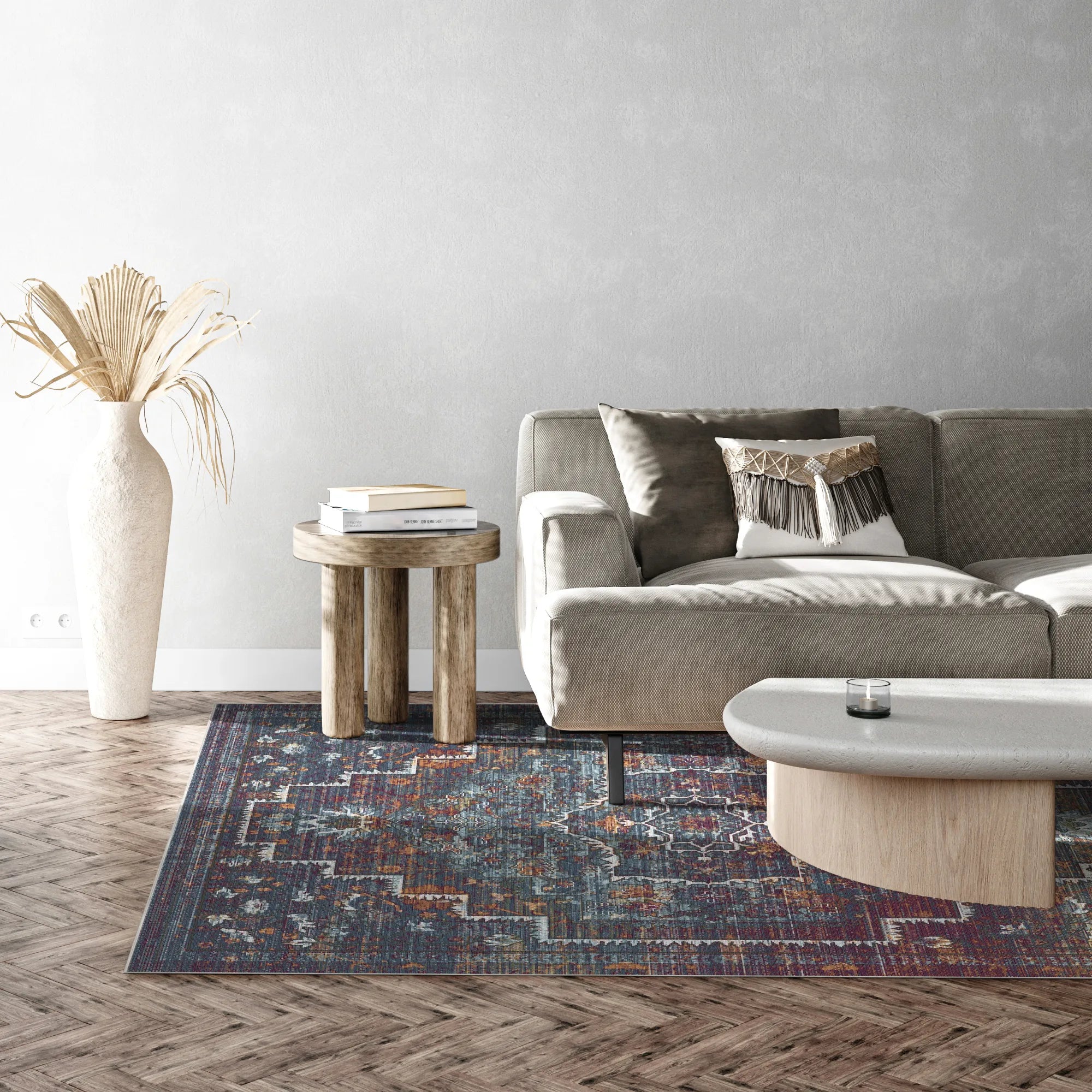 Verleihen Sie Ihrem Raum mit dem waschbaren Teppich „Nocturnal Stepped Medallion“ dramatische Eleganz und architektonische Pracht. Dieses raffinierte Stück interpretiert traditionelle persische Heriz-Designs neu und besticht durch ein markantes, mehrschichtiges Stufenmedaillon, das alle Blicke auf sich zieht. Die Farbpalette ist eine stimmungsvolle Hommage an Mitternachtstöne, die tiefes Indigo und Anthrazit mit rauchigen Akzenten in Pflaumenmagenta, Rostorange und antikem Türkis verbindet. Meisterhaft gealtert mit ausgeprägten horizontalen Streifen und gezielten Schatteneffekten, besitzt der Teppich die Seele eines jahrhundertealten Erbstücks, das in einem mondbeschienenen Herrenhaus entdeckt wurde. Er ist die perfekte Wahl für ein repräsentatives Esszimmer, ein stilvolles Arbeitszimmer oder einen modernen Wohnbereich, der ein markantes, historisches Herzstück mit modernem Touch verlangt.