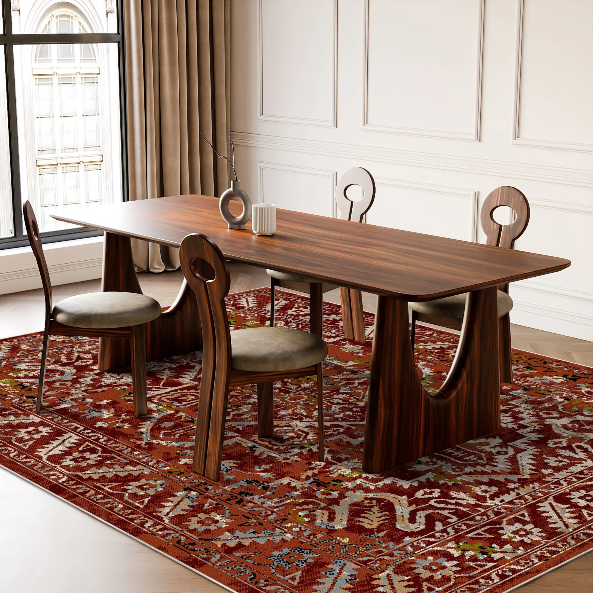 Verleihen Sie Ihrem Zuhause mit dem waschbaren Vintage-Teppich „Pompeii Rust “ zeitlose Wärme und historischen Charme. Inspiriert von den berühmten „Pompejanisch-Roten“ Fresken und dem sonnengetrockneten Lehm des antiken Mittelmeers, hüllt dieses Design Ihre Räume in eine warme, erdige Atmosphäre. Der Hintergrund bildet einen satten Farbton aus Terrakotta, Ziegelrot und Orange und schafft so eine lebendige und zugleich geerdete Basis. Vor diesem warmen Hintergrund heben sich das klassische geometrische Medaillon und die Bordüren im Heriz-Stil in kontrastierenden Tönen von kühlem Schieferblau, Olivgrün und zartem Creme ab. Die Used-Optik imitiert die verwitterte Textur eines ausgegrabenen Schatzes und macht den Teppich zur idealen Wahl für rustikale Bauernhäuser, Wohnzimmer im Bohème-Stil oder jeden Raum, der sich nach einer gemütlichen, einladenden Atmosphäre mit Geschichte sehnt.
