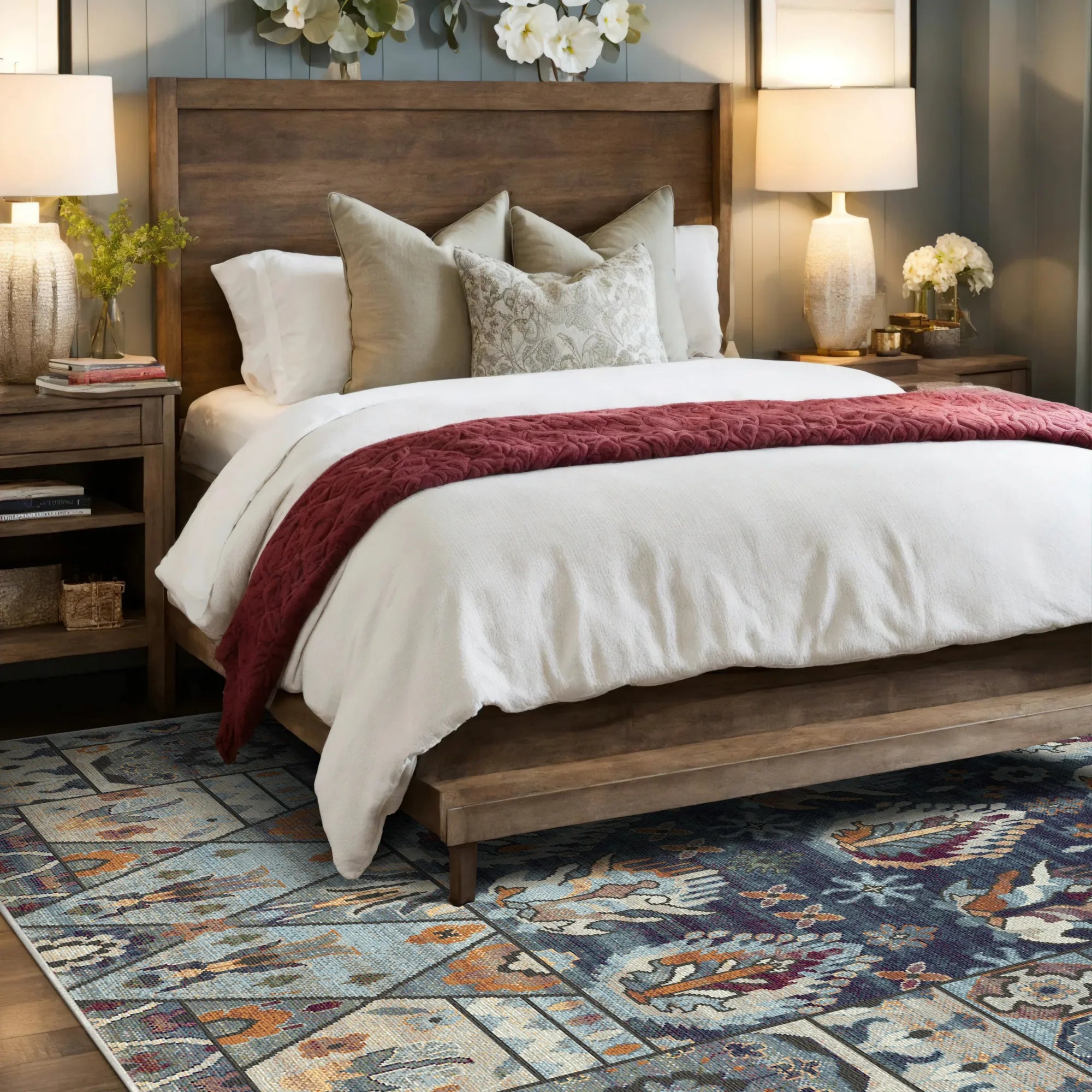 Verleihen Sie Ihrem Interieur mit dem waschbaren Teppich „Shirvan Indigo Traditional Geometric“ architektonische Präzision und kulturelle Tiefe. Inspiriert von den jahrhundertealten Webtraditionen des Kaukasus und der rhythmischen Symmetrie der Stammeskunst, besticht dieses Design durch ein Feld stilisierter „Lebensbaum“-Motive, die in einer majestätischen vertikalen Anordnung angeordnet sind. Eine tiefgründige Farbpalette aus Indigo und Schieferblau wird meisterhaft durch warmes Honiggold, Terrakotta und zartes Elfenbein akzentuiert. Die komplexen, ineinandergreifenden Bordüren aus Rauten und floralen Rosetten erzeugen einen beeindruckenden Rahmeneffekt und lassen den Teppich wie ein monumentales Textilkunstwerk wirken. Er ist die perfekte Wahl für ein elegantes Arbeitszimmer, ein formelles Esszimmer oder einen modernen Wohnbereich, der einen kraftvollen, strukturierten Blickfang mit historischem Prestige sucht.