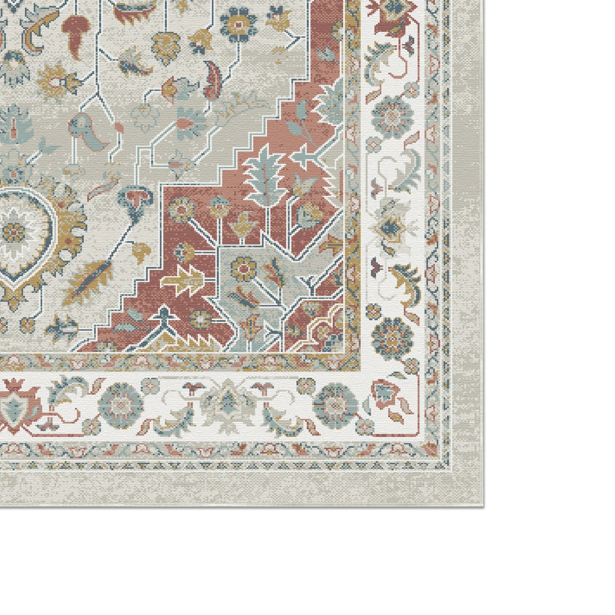 Vielseitige Farbpalette: Das ausgewogene Zusammenspiel von warmen und kühlen Tönen sorgt dafür, dass sich dieser Teppich mühelos mit verschiedenen Möbeln und Polstern kombinieren lässt.