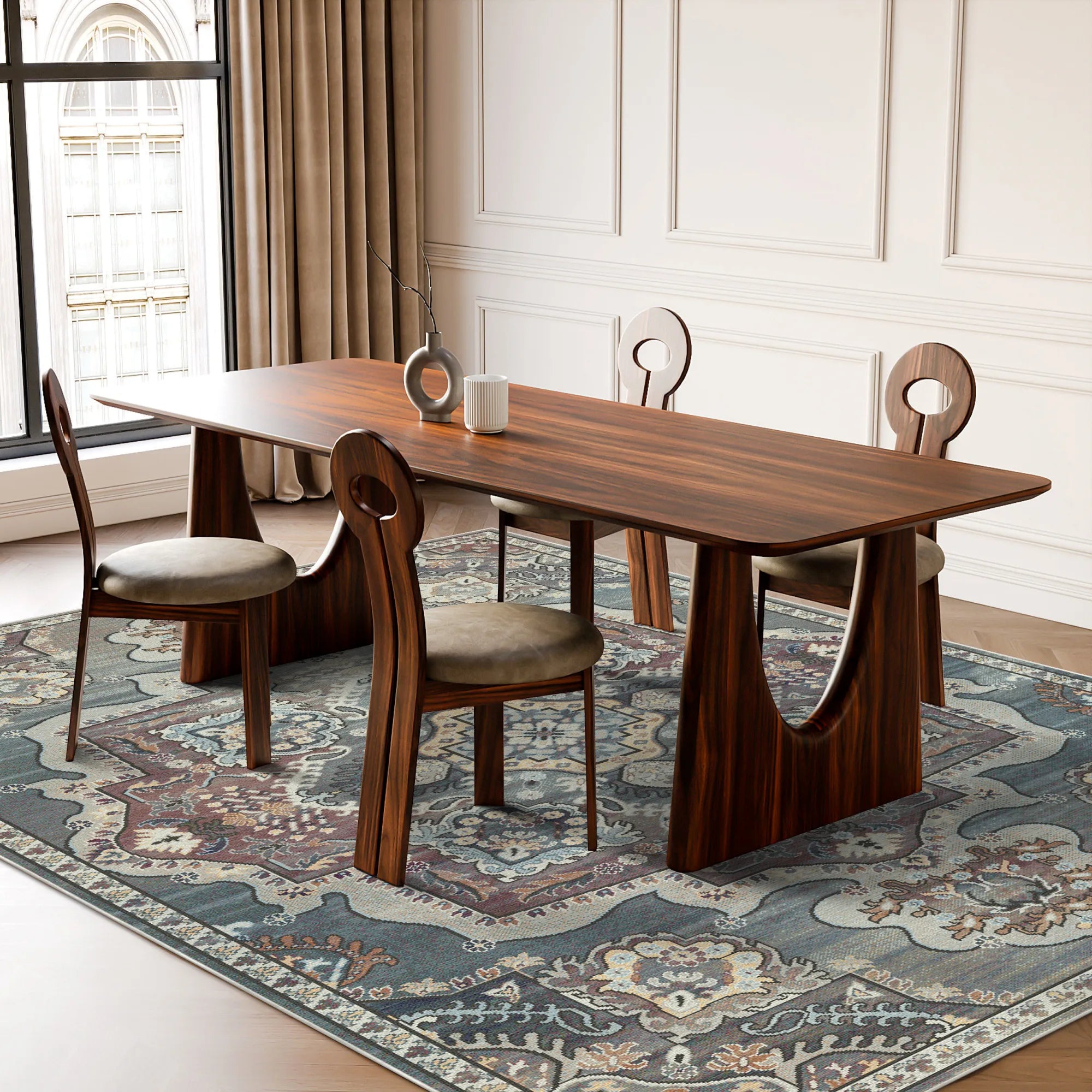 Genießen Sie die romantische Pracht und die zeitlose Eleganz des waschbaren Teppichs „Sultanic Rose Royal Medallion “. Dieses Design ist eine raffinierte Hommage an die legendären Webtraditionen der Paläste von Oushak und Isfahan. Ein übergroßes, detailreiches Medaillon im Zentrum verleiht dem Raum historische Würde. Der Teppichboden erstrahlt in einer atemberaubenden, vielschichtigen Farbpalette aus Altrosa, gedecktem Pflaumenrot und Schiefergrau, die einen Vintage-Effekt erzeugt und ihn wie ein wertvolles Erbstück wirken lässt. Anmutige, barock inspirierte Eckornamente und zarte florale Filigranmuster rahmen das zentrale Motiv ein, meisterhaft akzentuiert mit honiggoldenen und elfenbeinfarbenen Highlights. Ob Sie einem modernen Schlafzimmer einen Hauch von luxuriösem Charme verleihen, einem formellen Essbereich klassische Eleganz verleihen oder einem kreativen Büro einen Hauch von stimmungsvoller Eleganz geben möchten – dieser Teppich setzt ein starkes Statement zeitloser Zarafet-Kunst.