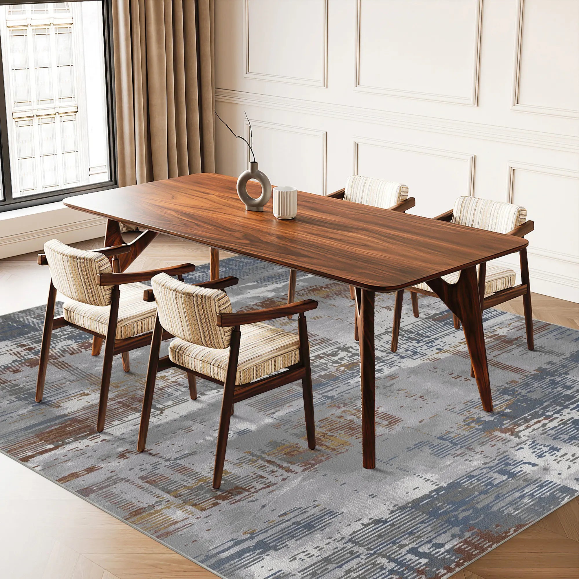Verleihen Sie Ihrem Raum mit dem Teppich „Tectonic Drift Industrial Glitch “ einen dynamischen, energiegeladenen Blickfang. Das anspruchsvolle Design besticht durch eine „digitale Glitch“-Ästhetik: Horizontale Blöcke in Denimblau, Terrakotta und Senfgold scheinen sich auf einem schweren , schiefergrauen und silbernen Untergrund zu verschieben und zu gleiten. Die vielschichtige, blockartige Komposition erinnert an verwitterte Werbetafeln in der Stadt oder an tektonische Platten in Bewegung. Dank seiner komplexen Farbgebung und des rauen, industriellen Charakters ist er die ideale Wahl für moderne Wohnzimmer, kreative Lofts oder zukunftsorientierte Büroräume.