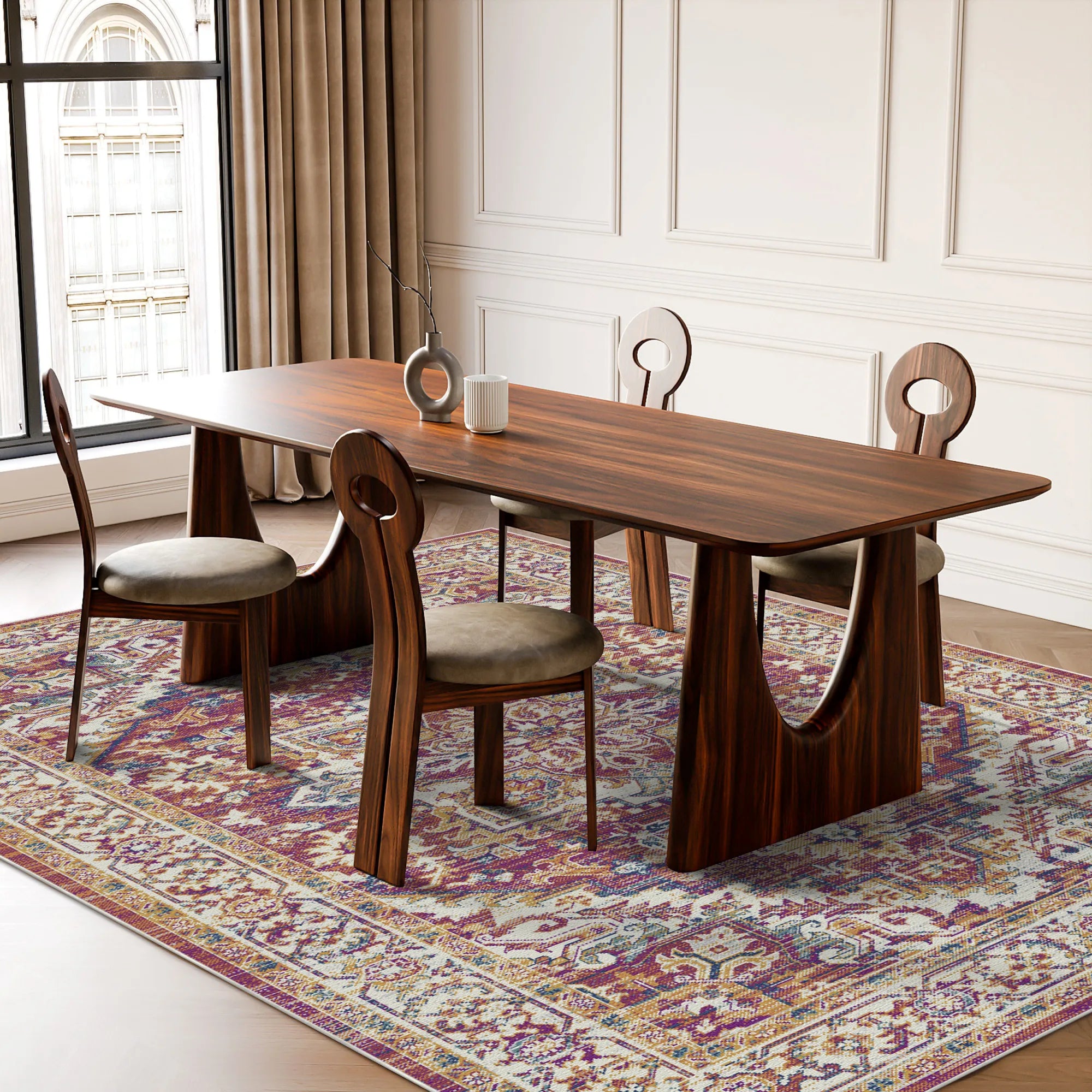 Verleihen Sie Ihrem Zuhause mit dem waschbaren Teppich „Terracotta Citadel Ornate Medallion“ eine behagliche Atmosphäre und architektonische Brillanz. Dieses atemberaubende Design interpretiert klassische Palastsymmetrie neu und besticht durch ein imposantes, gestuftes Medaillon in der Mitte, das dem Raum eine raffinierte Eleganz verleiht. Die Farbpalette zelebriert die warmen Töne des Sonnenuntergangs und vereint sattes Terrakotta, Magenta und Pflaume mit leuchtenden Akzenten in Senfgold und tiefem Marineblau. Meisterhaft bearbeitet mit einem stark abgenutzten Stone-Wash-Finish und malerischen horizontalen Streifen, besitzt der Teppich den geheimnisvoll schönen Charakter eines seltenen königlichen Wandteppichs, der in einer verborgenen Villa wiederentdeckt wurde. Er ist die perfekte Wahl für ein gemütliches Wohnzimmer im Bohème-Stil, ein repräsentatives Esszimmer oder eine romantische Master-Suite, die eine warme, kontrastreiche Basis mit einem raffinierten, antiken Herzstück verlangt.
