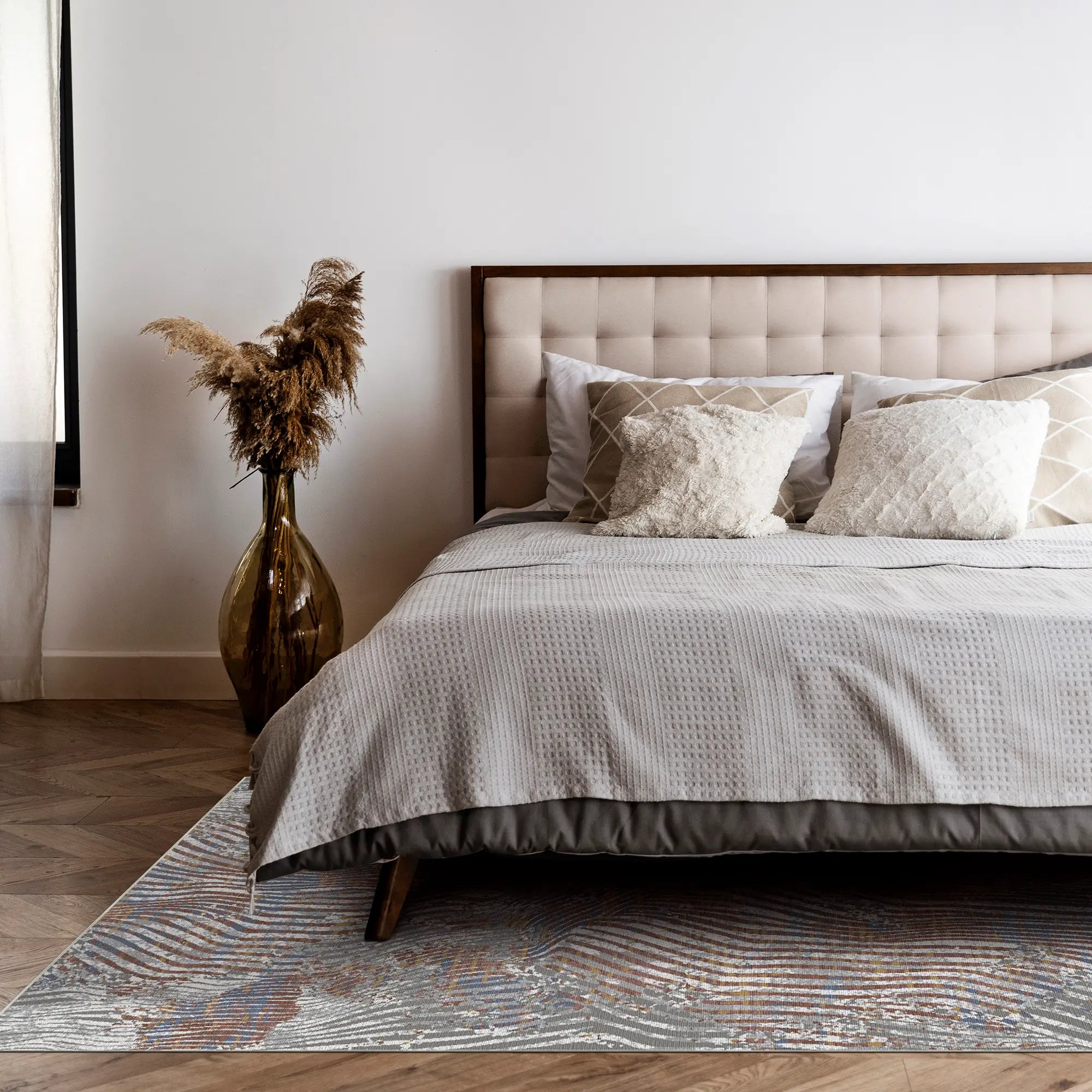 Verwandeln Sie Ihren Boden mit dem Abstrakten Teppich Topographic Ripple Distressed Abstract“ in ein organisches Kunstwerk. Das visuell faszinierende Design besticht durch eine rhythmische Komposition aus geschwungenen Linien, die an topografische Karten, Holzmaserung oder Sedimentablagerungen erinnern. Die Farbpalette ist eine raffinierte Mischung aus Anthrazitgrau und Silber , akzentuiert durch verwitterte Farbtupfer in Rostrot, Terrakotta und Orange . Die einzigartige Verbindung von geometrischer Präzision und organischer Patina macht ihn zum perfekten Blickfang für moderne Wohnzimmer, exklusive Lofts im Industriestil oder zeitgenössische Kreativstudios.