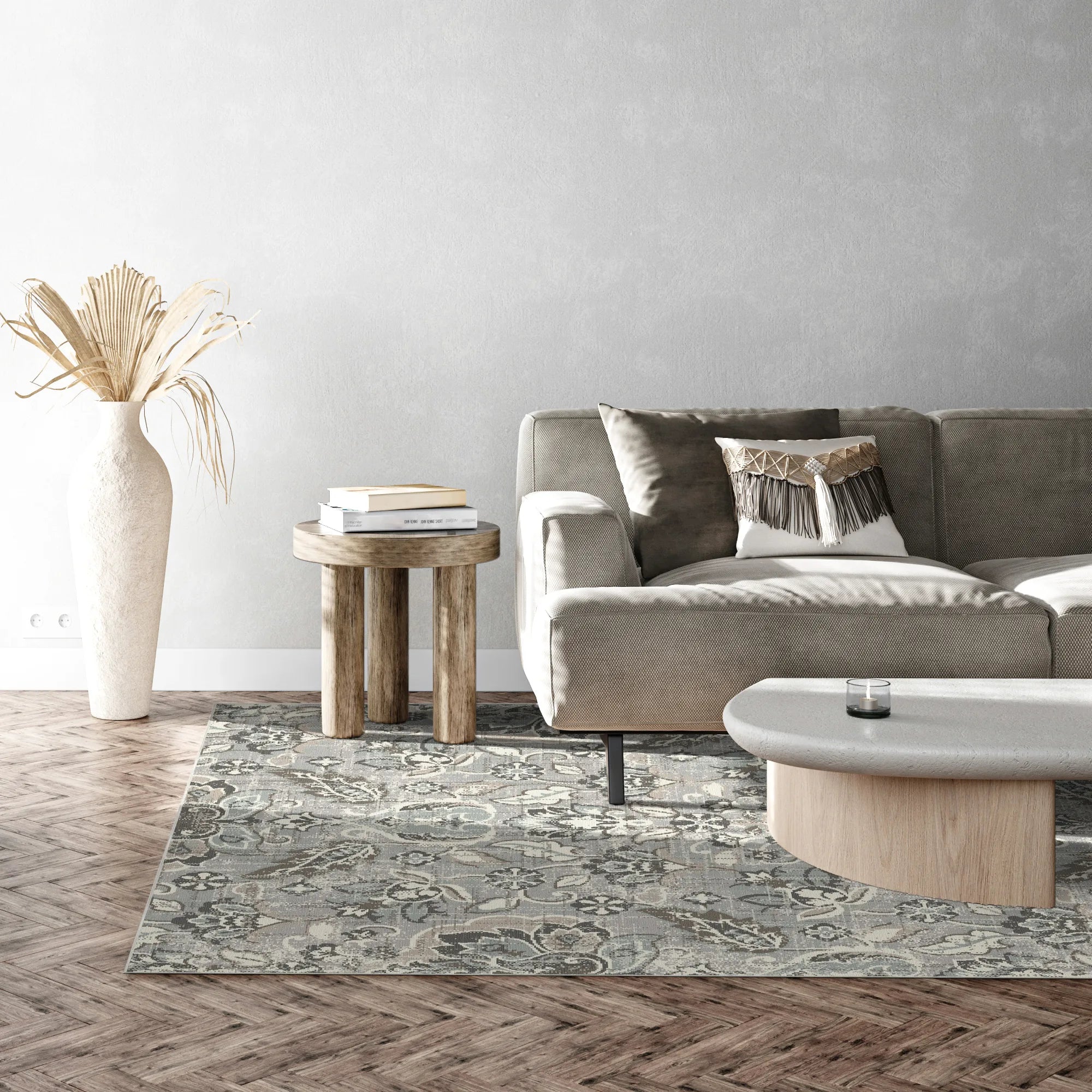 Verleihen Sie Ihrem Zuhause mit dem waschbaren Damastteppich „Camille Gray“ eine sanfte, romantische und zugleich elegante Note. Anders als bei traditionellen Teppichen mit zentralem Medaillon besticht dieses Design durch ein atemberaubendes, flächendeckendes Blumen-Damastmuster, das den sinnlichen Charme antiker französischer Wandteppiche widerspiegelt. Der Teppich bietet eine bemerkenswert beruhigende Farbpalette aus sanftem Silbergrau, gedecktem Salbeigrün und warmem Taupe, die sich harmonisch von einem elfenbeinfarbenen Hintergrund abhebt. Die bewusst eingesetzte, intensive Vintage-Optik verleiht ihm eine charmante, gealterte Textur und macht ihn zur idealen Wahl für ein gemütliches Schlafzimmer im Shabby-Chic-Stil, ein elegantes Esszimmer im französischen Landhausstil oder ein ruhiges Wohnzimmer, das nach subtiler, raffinierter Schönheit verlangt.