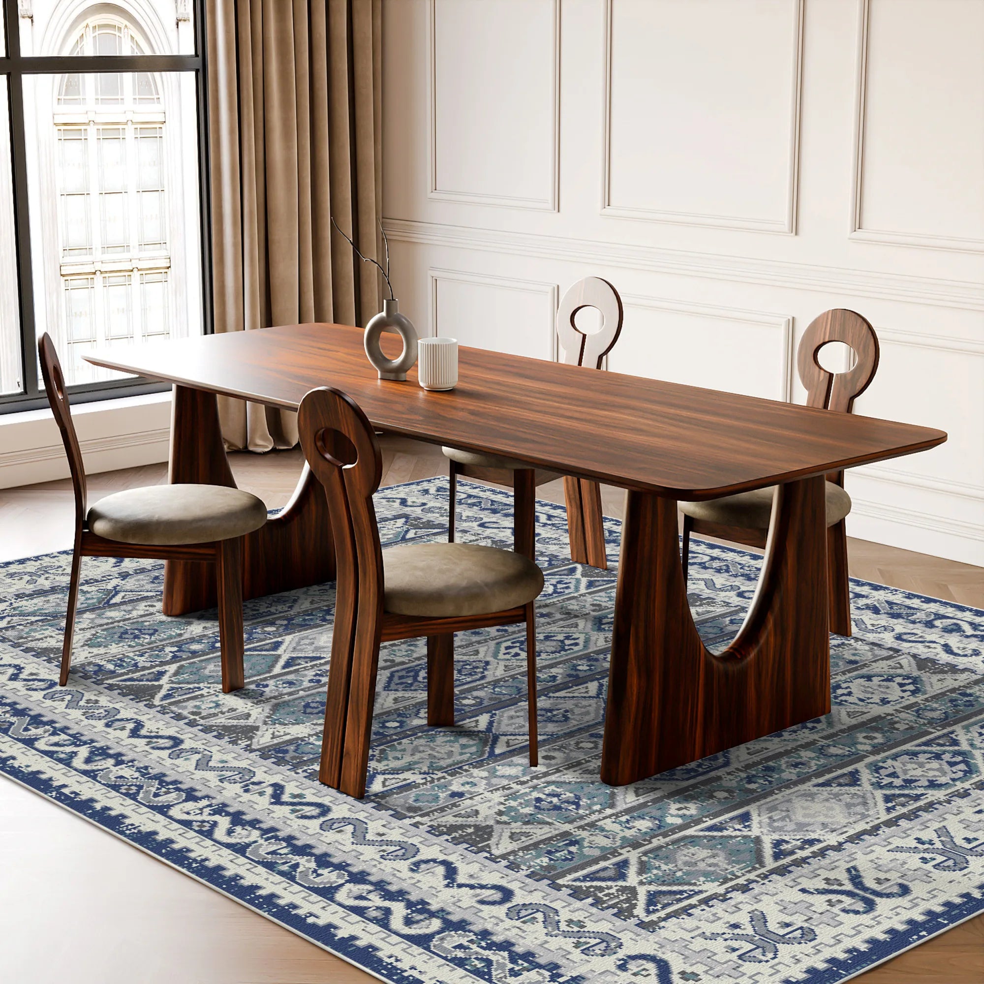 Wahrer Luxus entsteht dort, wo Schönheit auf Widerstandsfähigkeit trifft. Dieser Teppich wurde aus hochwertigen, dichten Polyestergarnen gefertigt und bietet so eine weiche Textur, die den Belastungen des Alltags standhält. Das raffinierte Zusammenspiel von Blau- und Grautönen ist so gestaltet, dass Schatten und Flusen auf natürliche Weise kaschiert werden. Die natürliche Fleckenbeständigkeit der Fasern sorgt dafür, dass die tiefen, satten Indigotöne über Jahre hinweg erhalten bleiben. Die hochwertige, rutschfeste Unterseite bietet sicheren Halt auf Parkett-, Fliesen- oder Laminatböden und gewährleistet so Stabilität und Sicherheit ohne zusätzliche Unterlagen.