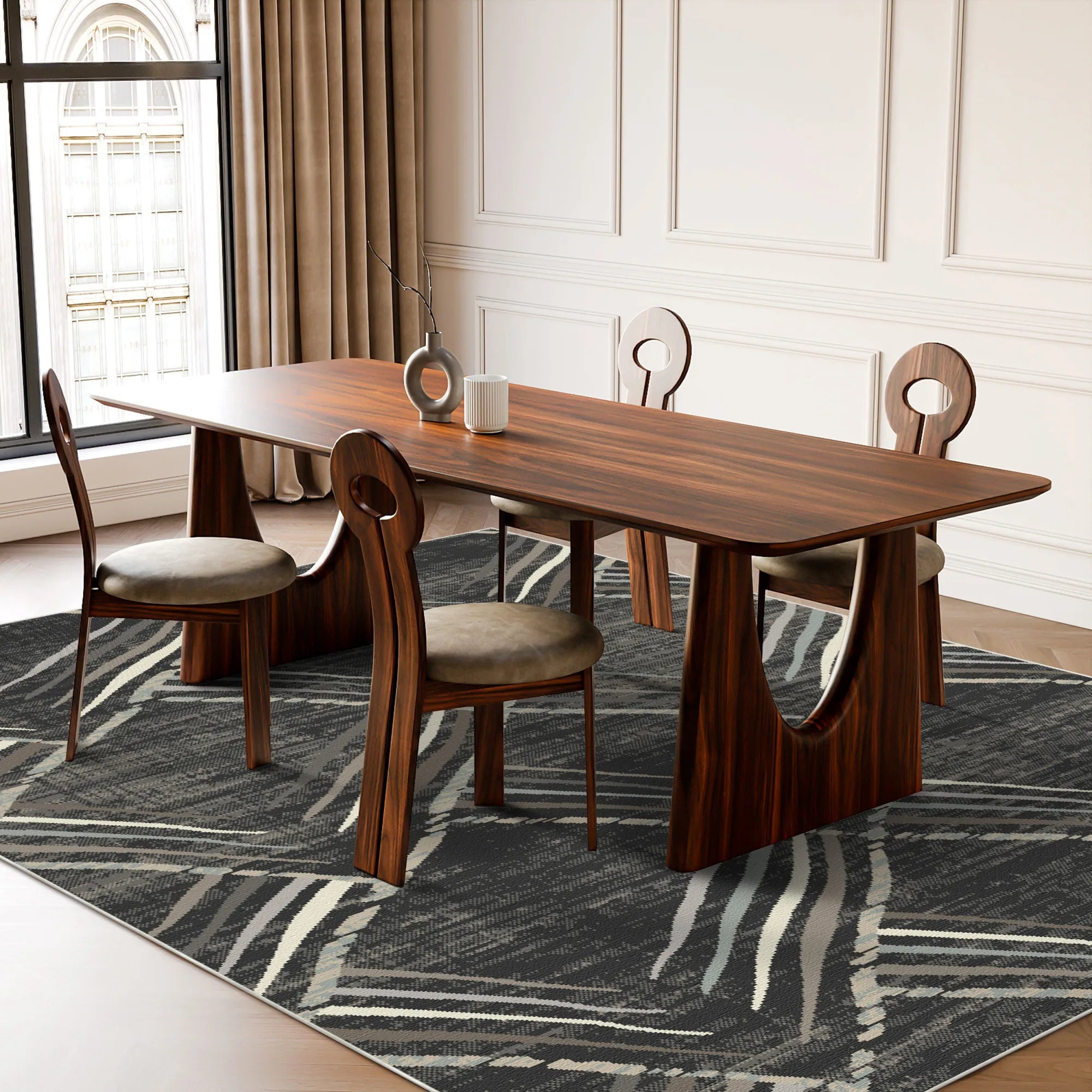 Dieser Teppich wurde für die Anforderungen des modernen Lebens entwickelt und ist aus hochdichtem Polyestergarn gewebt. Seine Oberfläche ist weich und gleichzeitig äußerst strapazierfähig und widerstandsfähig gegen Flecken und Abnutzung. Dank der robusten, rutschfesten Unterseite liegt der Teppich sicher auf harten Böden wie Holz oder Fliesen und bietet so zusätzliche Sicherheit. Wir setzen auf unkomplizierte Pflege: Der Teppich ist vollständig maschinenwaschbar , sodass Sie seine satten, dunklen Farben mühelos erhalten können. Sein flacher, glatter Flor ist speziell für die Reinigung mit Saugrobotern konzipiert, sodass Ihre automatischen Reinigungsgeräte mühelos über die strukturierte Oberfläche gleiten können.