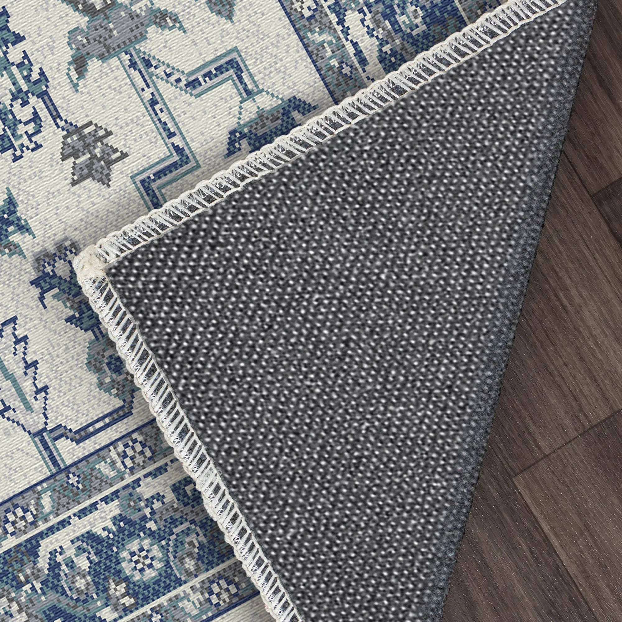 Wir wissen, dass ein Zuhause zum Leben da ist und nicht nur zum Bewundern aus der Ferne. Deshalb haben wir uns von empfindlicher Seide oder Wolle verabschiedet und diesen Teppich aus modernen, hochdichten Polyesterfasern gefertigt. Das Ergebnis ist eine Textur, die der Weichheit eines antiken Erbstücks in nichts nachsteht, aber gleichzeitig robust genug ist, um den Anforderungen des modernen Lebens standzuhalten. Die Vintage-Optik mit Gebrauchsspuren ist bewusst gewählt; sie verleiht dem Teppich einen charmanten, wohnlichen Charakter, der kleine Krümel oder Fußabdrücke kaschiert, während die integrierte Fleckenbeständigkeit der Fasern dafür sorgt, dass der klare Kontrast zwischen Blau und Weiß erhalten bleibt. Die hochwertige, rutschfeste Unterseite fixiert den Teppich sanft und sorgt dafür, dass er auf Ihren Parkett- oder Fliesenböden perfekt an seinem Platz bleibt – ganz ohne zusätzliche Unterlage.
