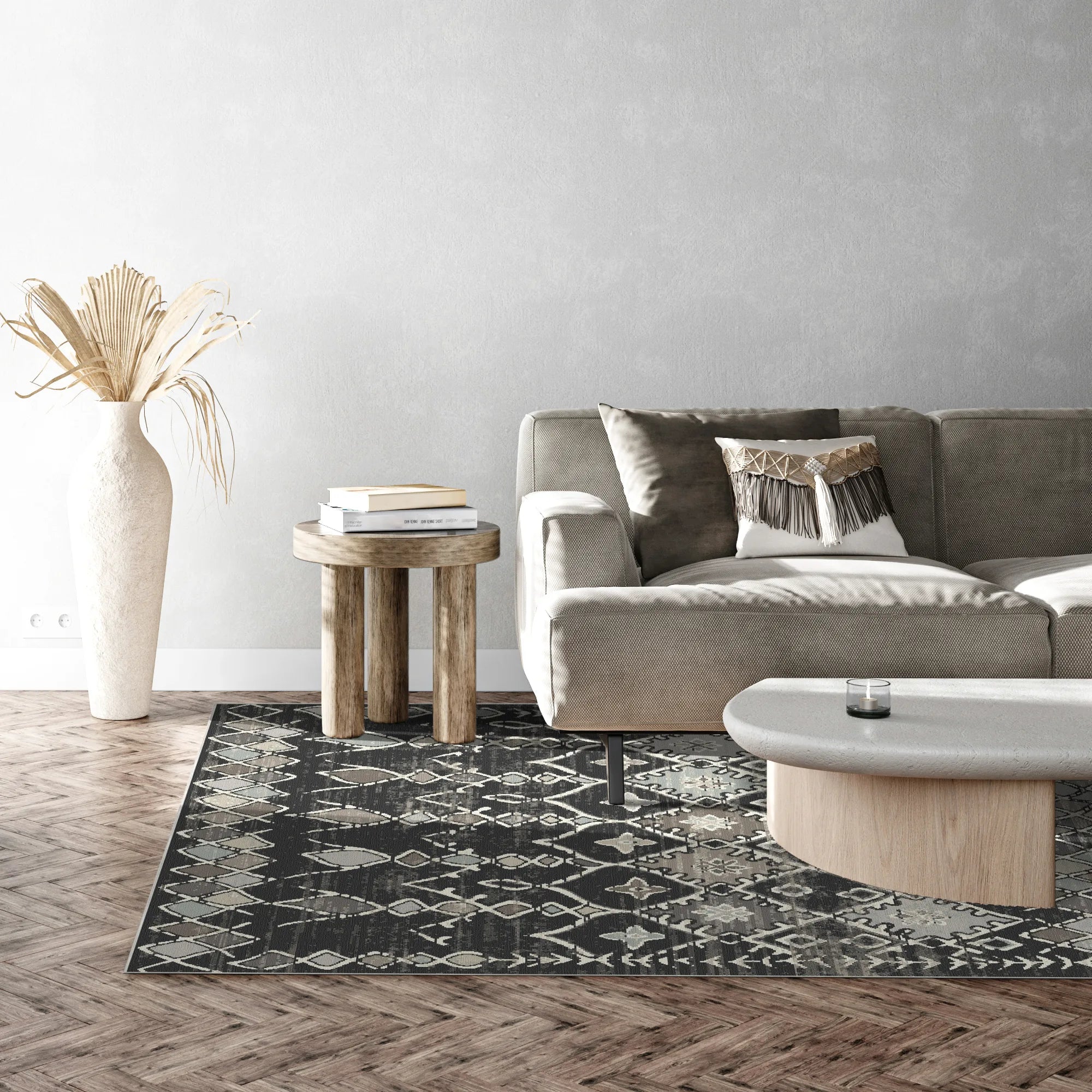 Setzen Sie ein starkes Statement mit der eindrucksvollen Tiefe des waschbaren Teppichs „Mayan Night Tribal“ . Diese markante Variante aus unserer Ethnic-Kollektion interpretiert das kunstvolle Stammesmuster in einer stimmungsvollen, raffinierten Farbpalette neu. Der tiefschwarze Hintergrund bildet eine kraftvolle Leinwand für die stilisierten Rauten- und Pfeilmotive, die in kontrastierenden Nuancen von Hellgrau, Steinbeige und gedecktem Schieferblau gehalten sind. Die Used-Optik unterstreicht den handwerklichen Charakter des Teppichs und macht ihn zur perfekten Ergänzung für moderne Lofts im Industrial-Stil, maskuline Arbeitszimmer oder Bohème-Räume, die sich nach einem Hauch dunkler Eleganz sehnen.