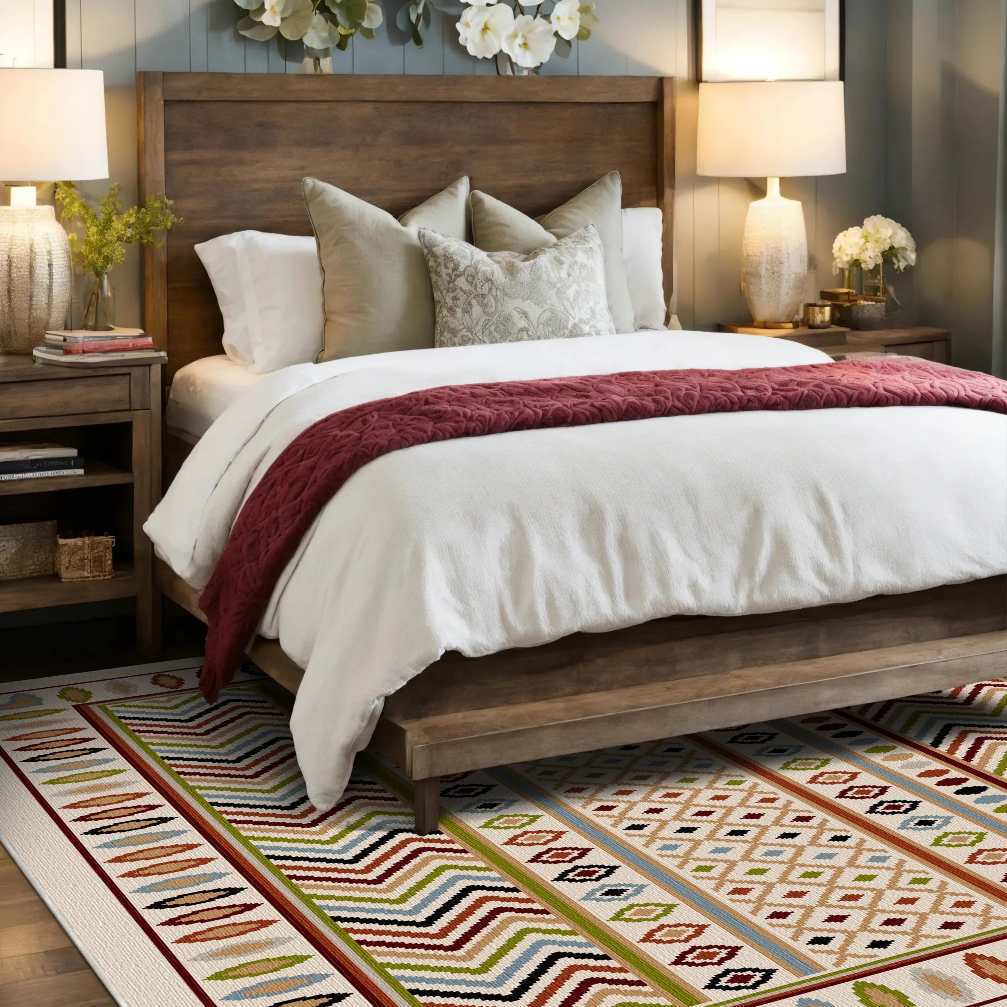 Holen Sie sich mit dem waschbaren Teppich „Painted Mesa Geometric“ die lebendige Energie des Südwestens in Ihr Zuhause. Diese dynamische Variante unserer geometrischen Serie besticht durch ihre Farbenpracht: Rostorange, Salbeigrün, Himmelblau und Anthrazit heben sich elegant vom warmen Cremeton ab. Das kunstvolle, lineare Design kombiniert Chevron-Wellen und Rautenmuster und erinnert an traditionelle Navajo-Webereien. Damit ist dieser Teppich das perfekte Statement-Piece für Interieurs im Bohème-, Eklektik- oder Santa-Fe-Stil, die einen Hauch von Persönlichkeit versprühen möchten.