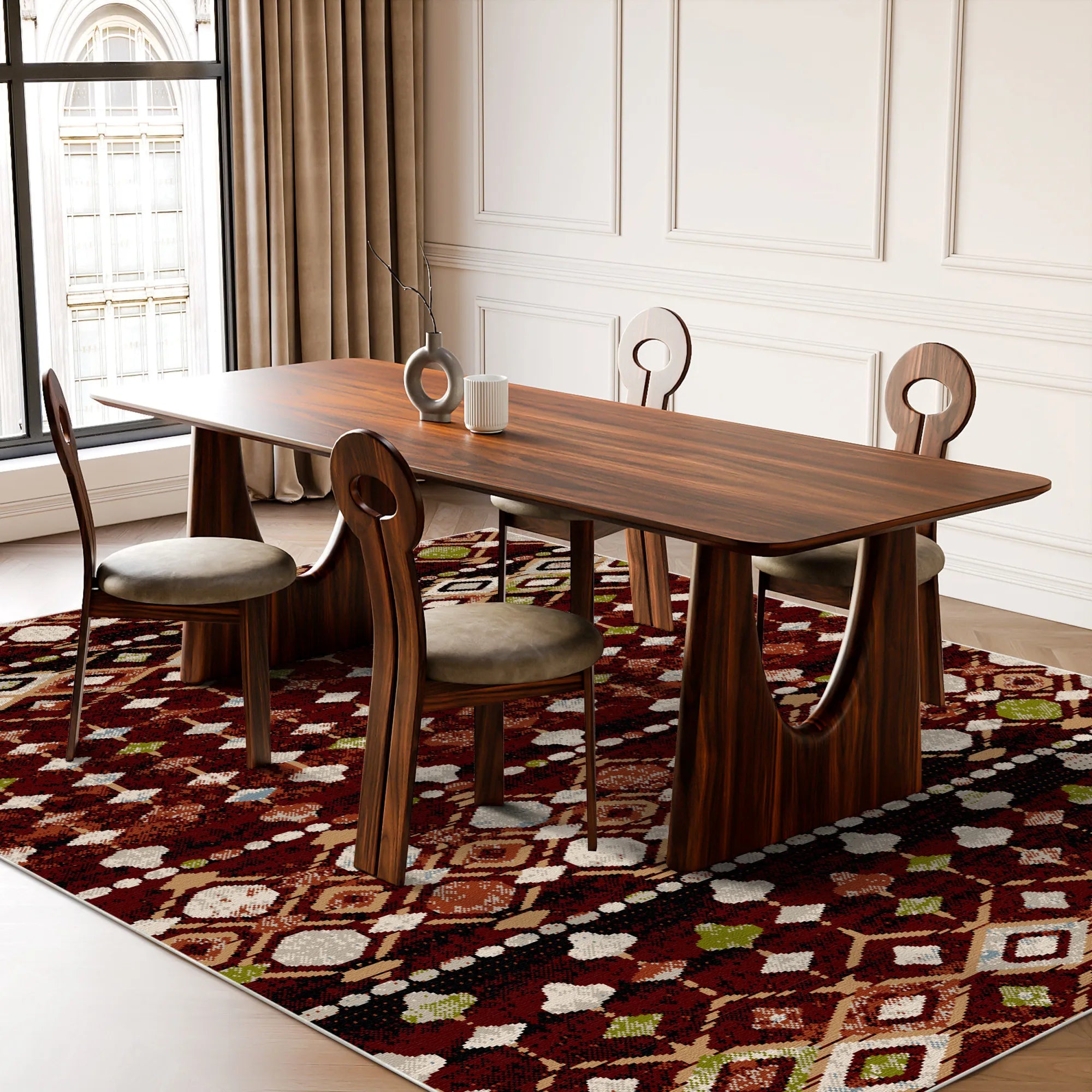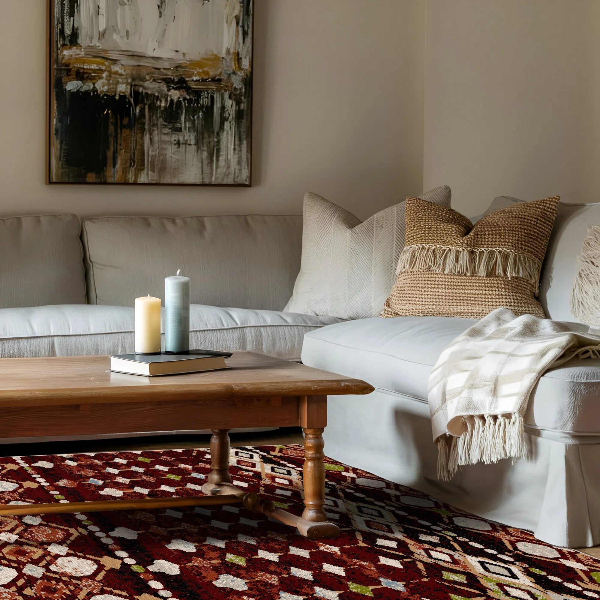 Wir sind überzeugt, dass wahrer Stil den Anforderungen des Alltags standhalten muss. Deshalb ist dieser Teppich meisterhaft aus hochwertigen, hochdichten Polyesterfasern gewebt. Diese fortschrittliche Konstruktion sorgt für eine luxuriös weiche Oberfläche, die gleichzeitig die nötige Strapazierfähigkeit für stark frequentierte Bereiche bietet. Die tiefrote Farbpalette ist nicht nur optisch ansprechend, sondern auch praktisch, da sie Gebrauchsspuren kaschiert. Die natürliche Fleckenbeständigkeit der Fasern garantiert zudem, dass die Farben lange kräftig und schön bleiben. Für einen sicheren Stand in Ihrem Zuhause haben wir eine hochwertige, rutschfeste Unterseite integriert, die fest auf Hartholz-, Fliesen- oder Laminatböden haftet und somit eine separate Teppichunterlage überflüssig macht.