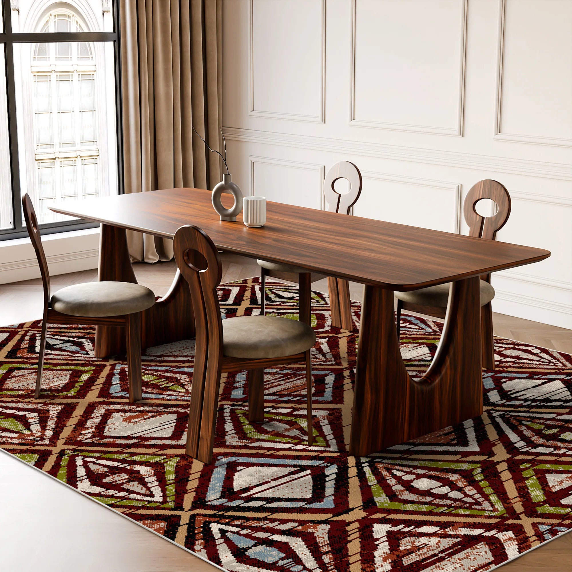 Verleihen Sie Ihrem Wohnraum mit dem waschbaren Teppich „Zion Mahogany Geometric“ die majestätische Wärme und die raue Schönheit der Canyonlandschaft. Dieses Design interpretiert unsere charakteristische Rautenmuster-Serie auf besonders intensive und satte Weise. Der Hintergrund besticht durch ein reichhaltiges Farbspektrum aus tiefem Mahagonibraun, Espresso und Rostrot und schafft so eine behagliche und zugleich ausdrucksstarke Atmosphäre. Vor diesem dunklen Erdton heben sich die geometrischen Motive in Olivgrün, Schieferblau und sanftem Beige deutlich ab und erinnern an das Spiel von Licht und Schatten auf roten Felsformationen. Dieser Teppich ist die ideale Wahl für eine warme und einladende Atmosphäre in einem rustikalen Wohnzimmer, einem gemütlichen Blockhaus-Ambiente oder einem Schlafzimmer, das sich nach einer markanten und bodenständigen Ästhetik sehnt.